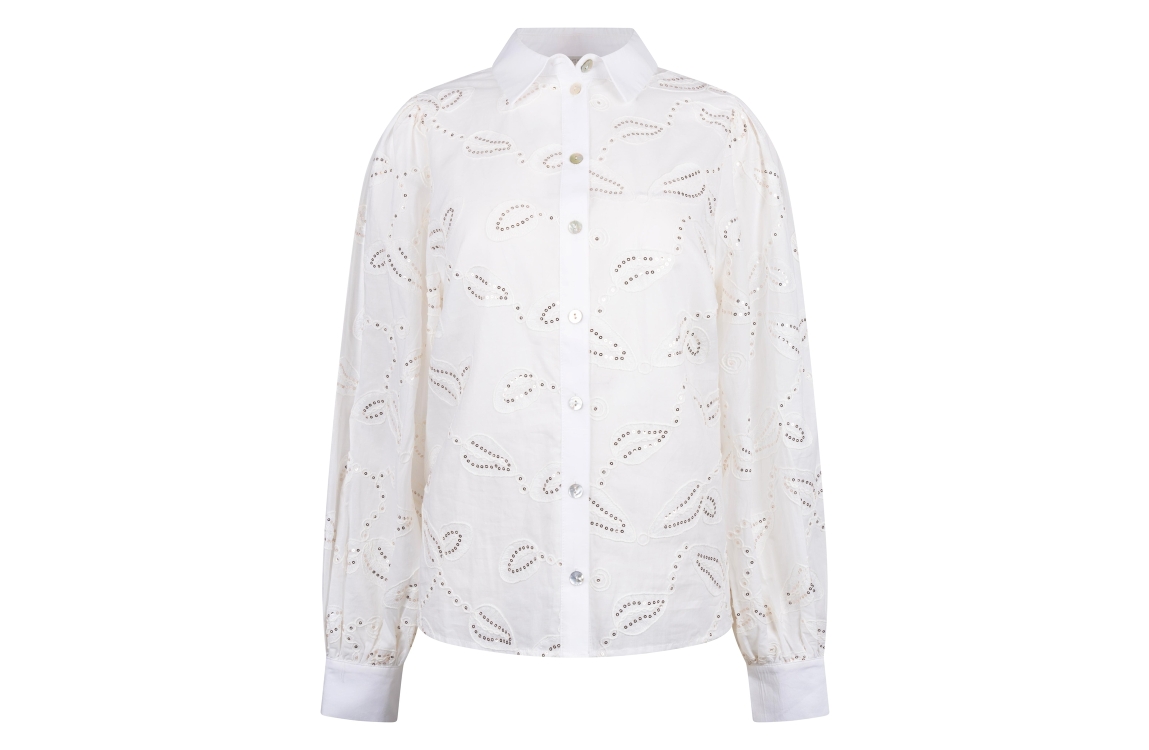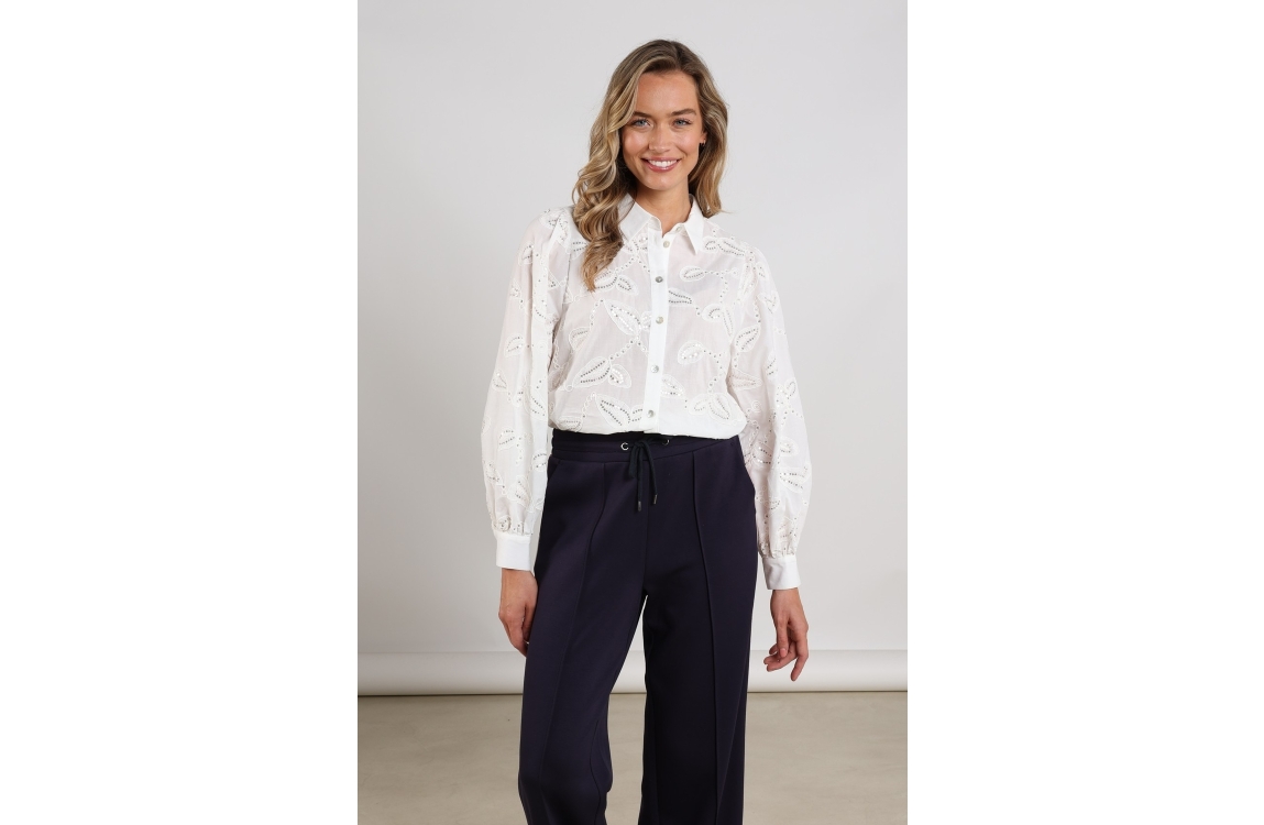 NUKUS Milanova Blouse 17 off white. Dit rechtvallende model is voorzien van een kraag en heeft lange mouwen. Deze off-white blouse van Nukus sluit door middel van knopen en is all-over bewerkt met subtiele pailletten.