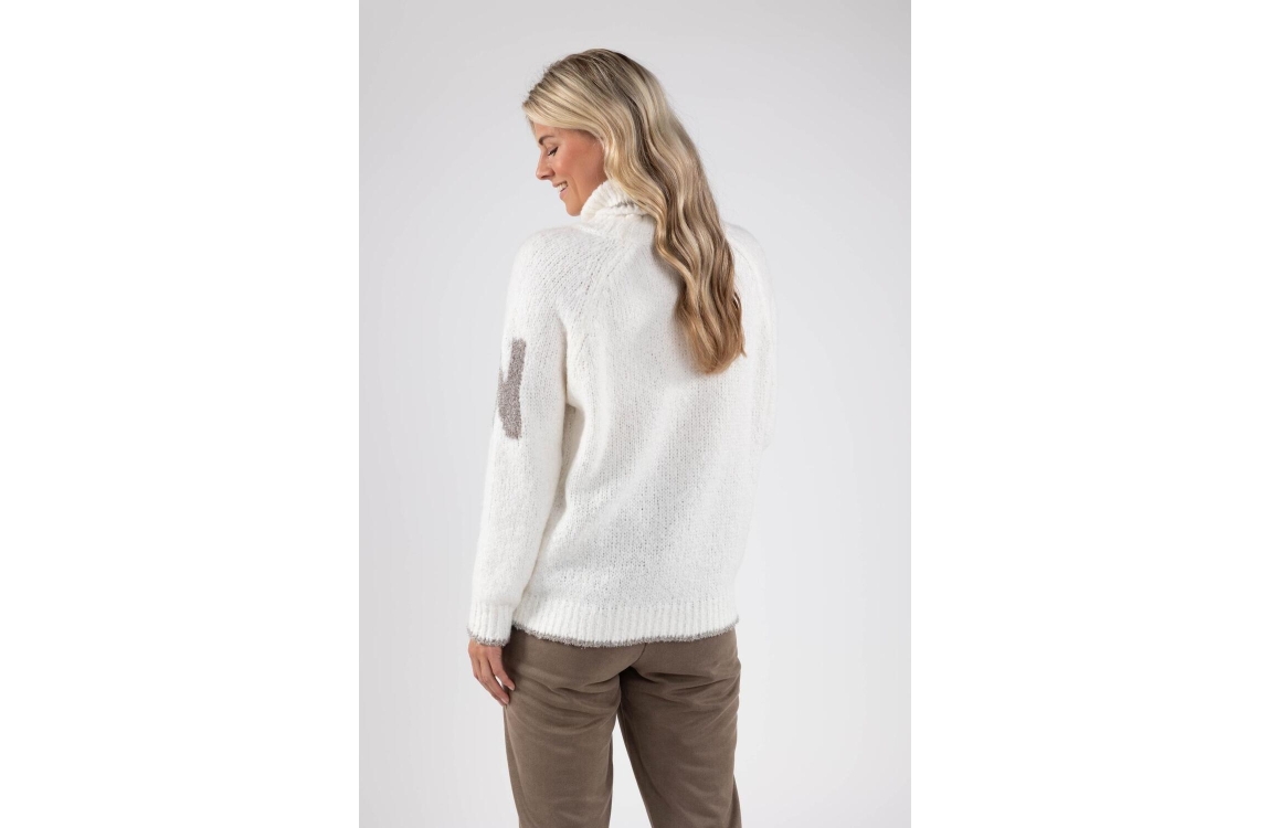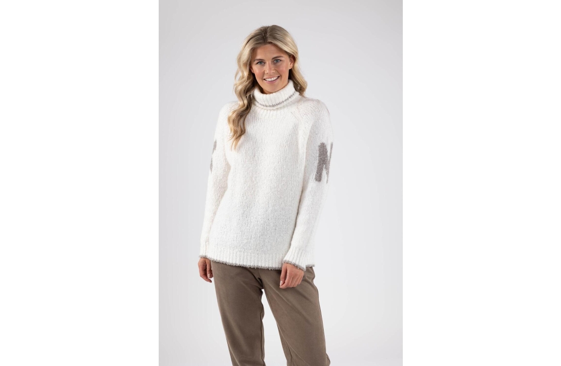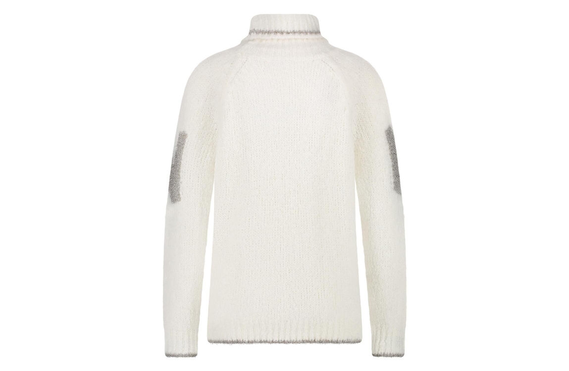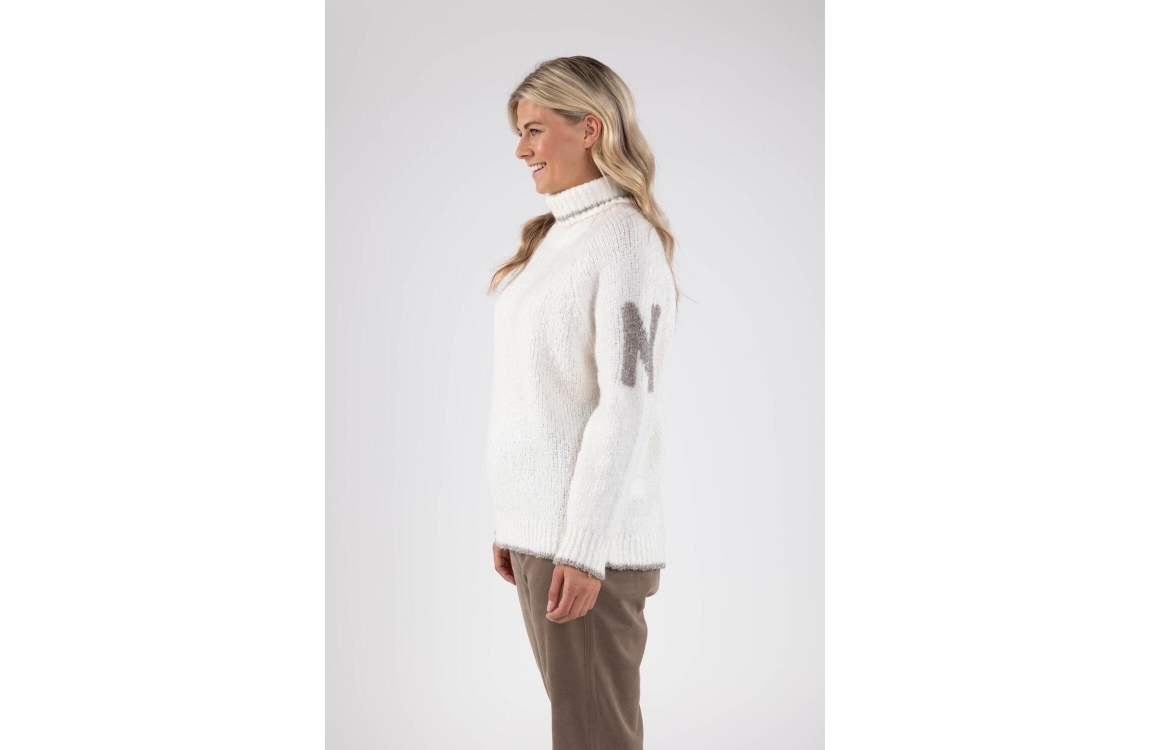 Nukus Niky pullover. Dit rechtvallende model is voorzien van een col en heeft lange mouwen. Deze witte trui van Nukus is bewerkt met een zilveren N&K op de mouw, maar is ook bij de kraag en mouw bewerkt met een zilveren bies.
