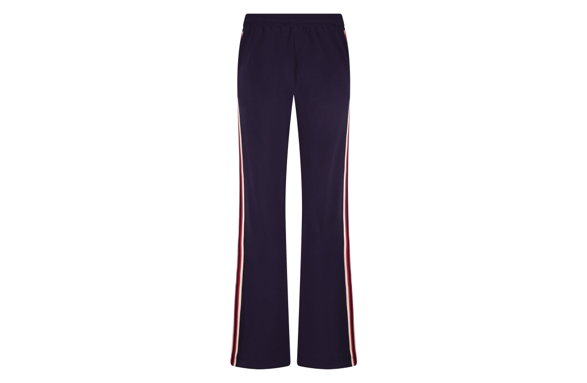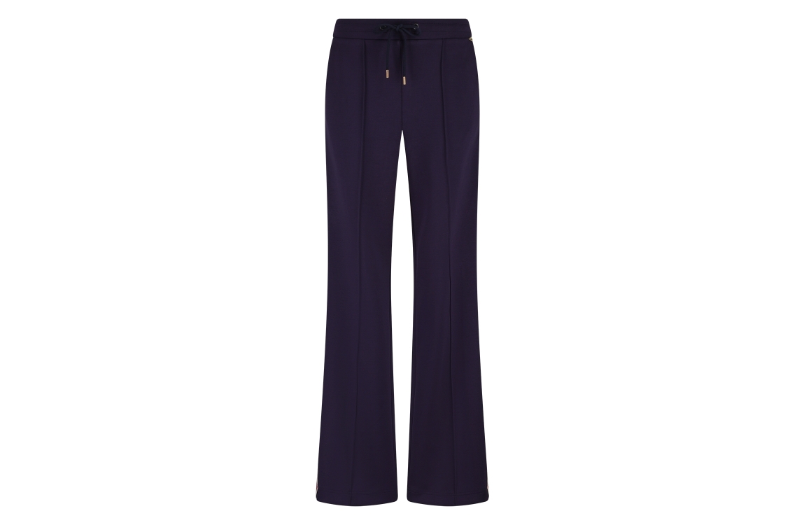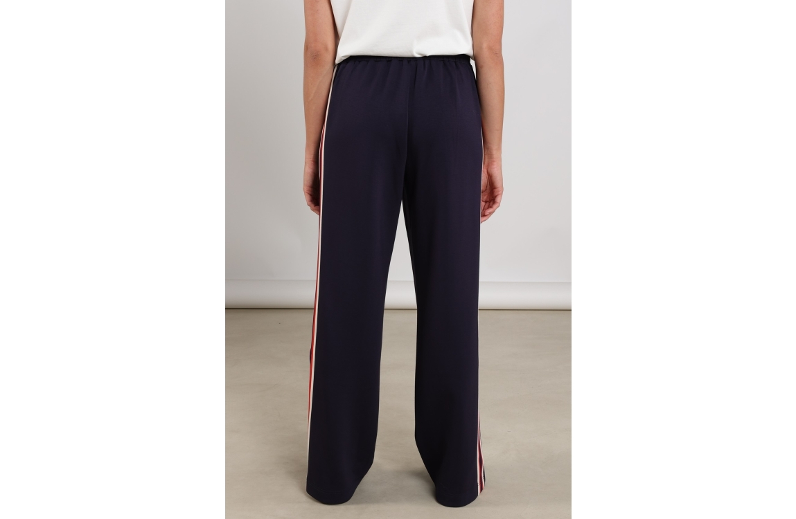 NUKUS Nora Pants 70 navy. Dit rechtvallende model sluit door middel van een elastische tailleband met trekkoord. Deze donkerblauwe broek van NUKUS beschikt over twee steekzakken aan de voorzijde. Dit model is aan de zijkant bewerkt met een tape in de kleuren rood, beige en donkerblauw.