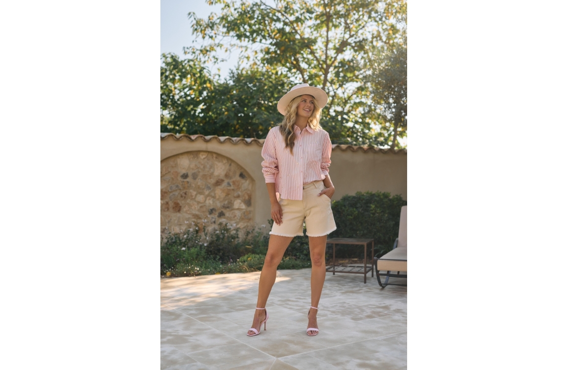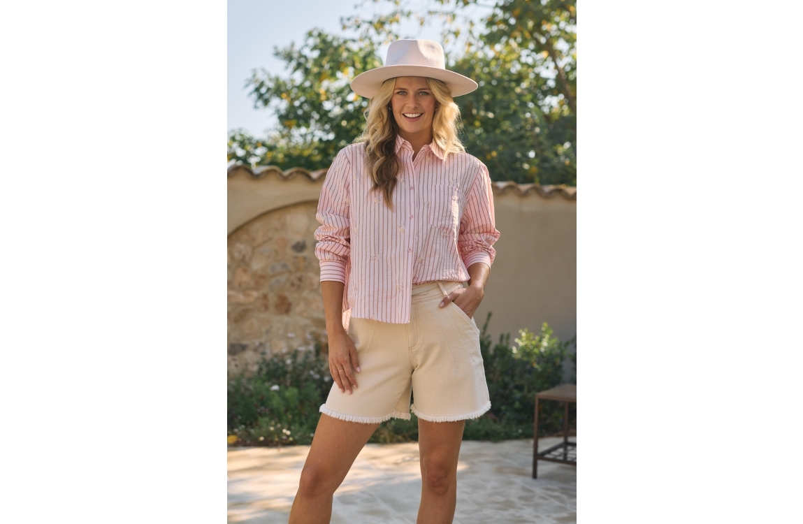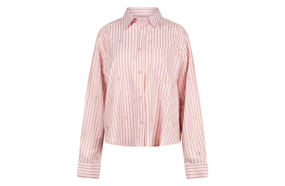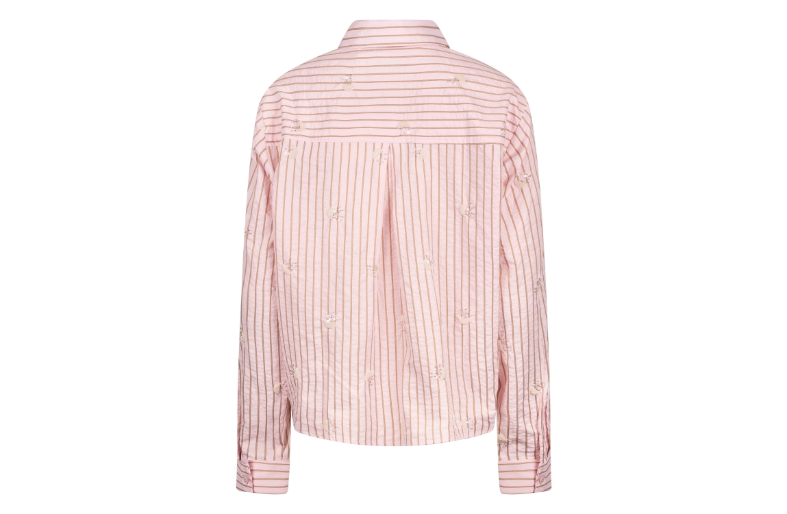 NUKUS Nowi Blouse Stripe 30 blush. Dit rechtvallende model heeft een kraag en lange mouwen. Deze licht roze blouse van NUKUS sluit door middel van knopen en is bewerkt met een streeppatroon in combinatie met zilveren details.