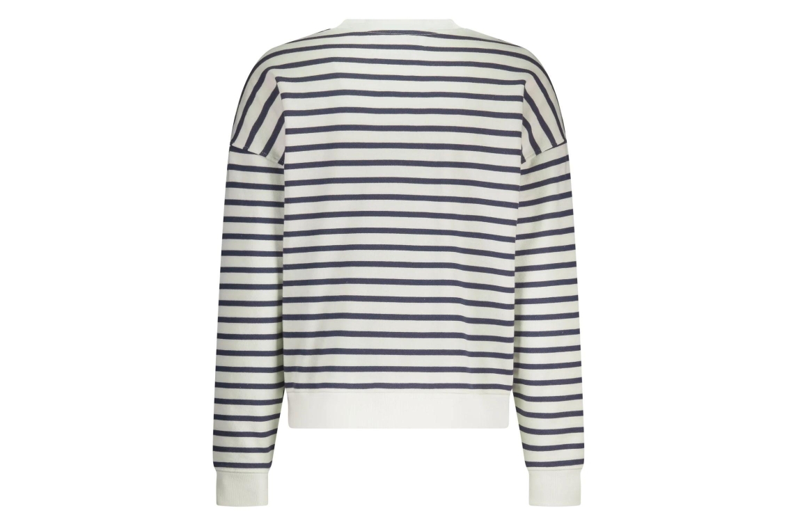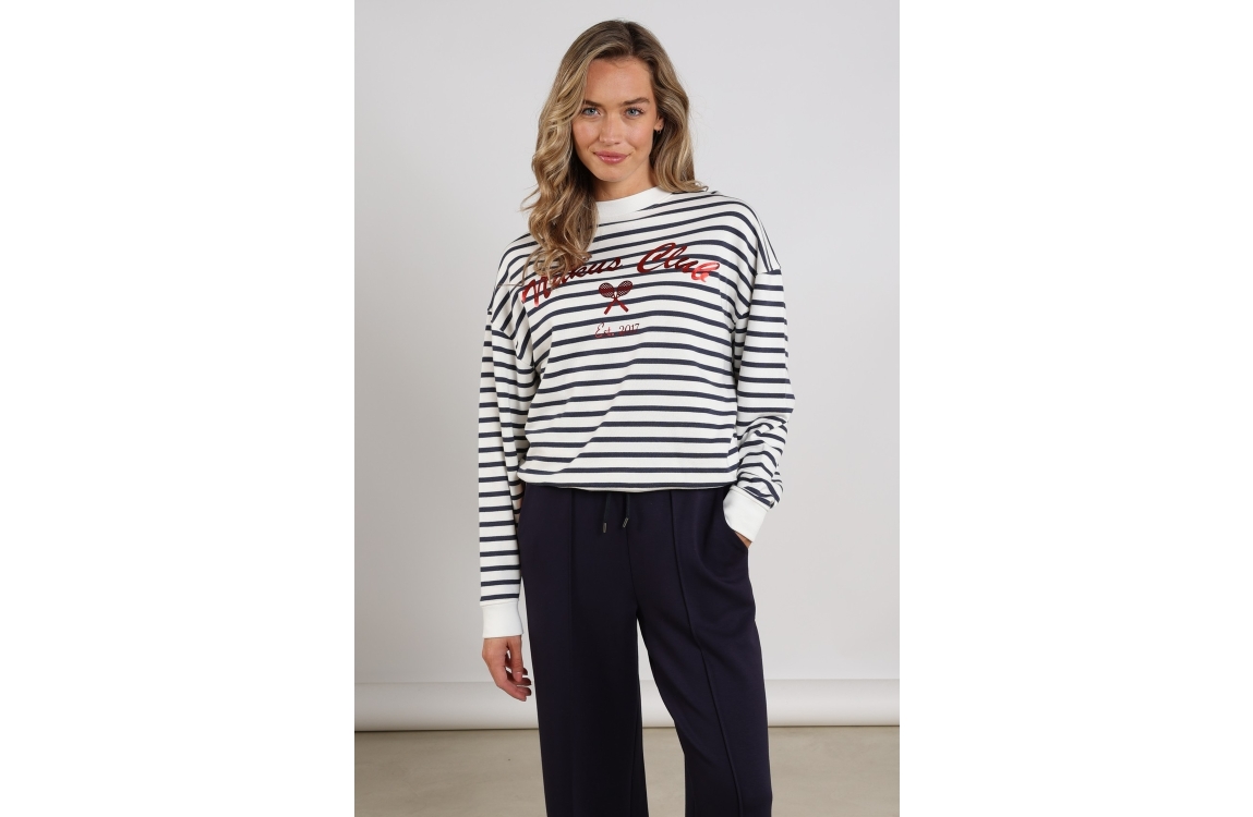 NUKUS Paige Sweater Stripe 137 white/blue. Dit rechtvallende model heeft een ronde hals en lange mouwen. Deze wit/blauw gestreepte sweater van Nukus is op het voorpand bewerkt met een opdruk en is afgewerkt met boorden.