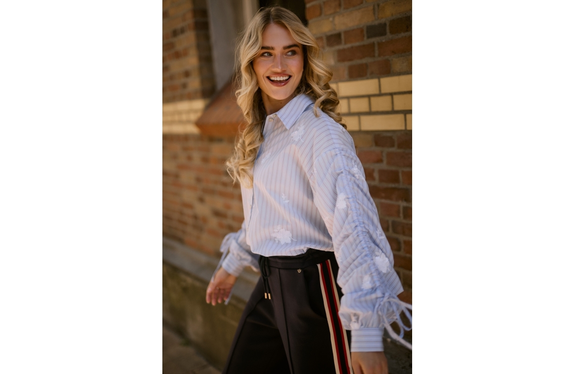 NUKUS Rosa Blouse Stripe 371 sky/kiss. Dit rechtvallende model heeft een kraag en lange mouwen. Deze lichtblauwe blouse van NUKUS sluit door middel van knopen en is bewerkt met een strikdetail op de mouw. Dit model is all-over bewerkt met geborduurde bloemen.