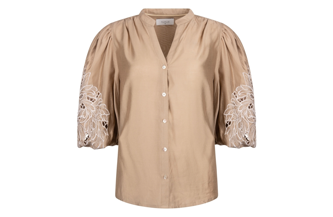 NUKUS Rosie Blouse Embrodery 64 camel. Dit wijdvallende model is voorzien van een V-hals en heeft korte mouwen. Deze bruine blouse van Nukus sluit door middel van knopen aan de voorzijde. Dit model is op de mouwen bewerkt met opengewerkte embroidery.