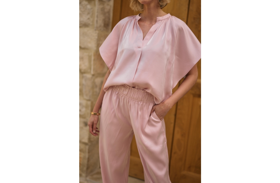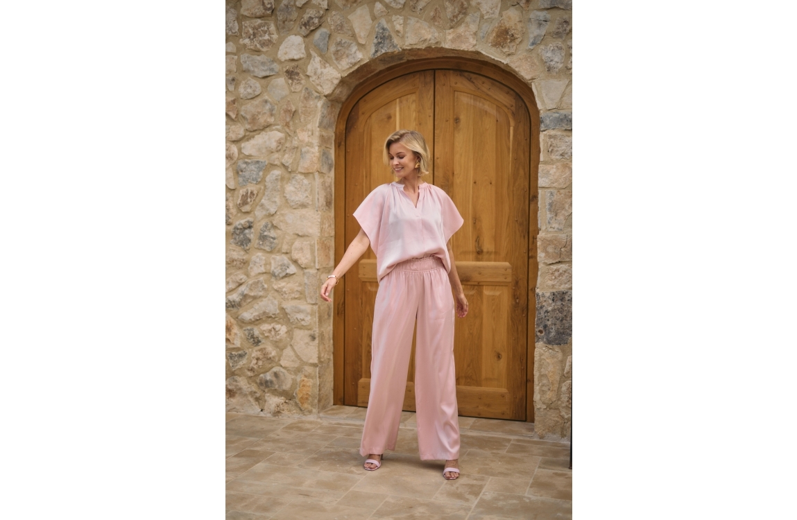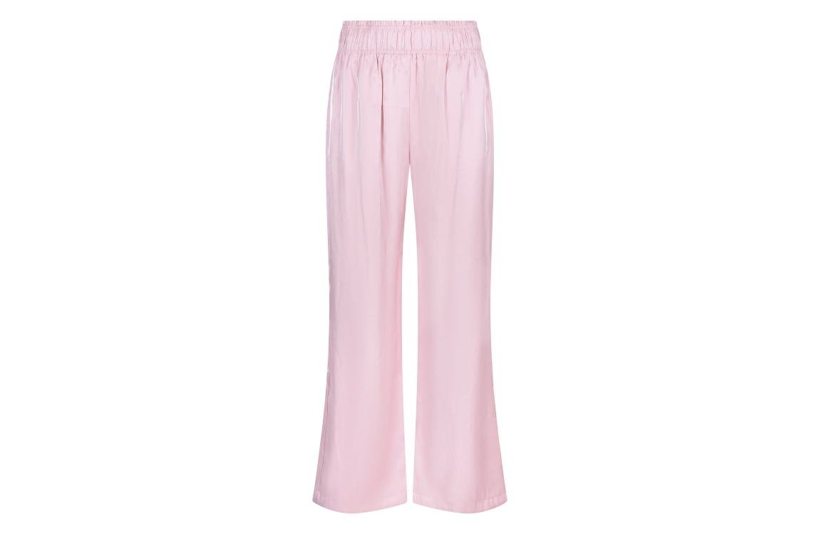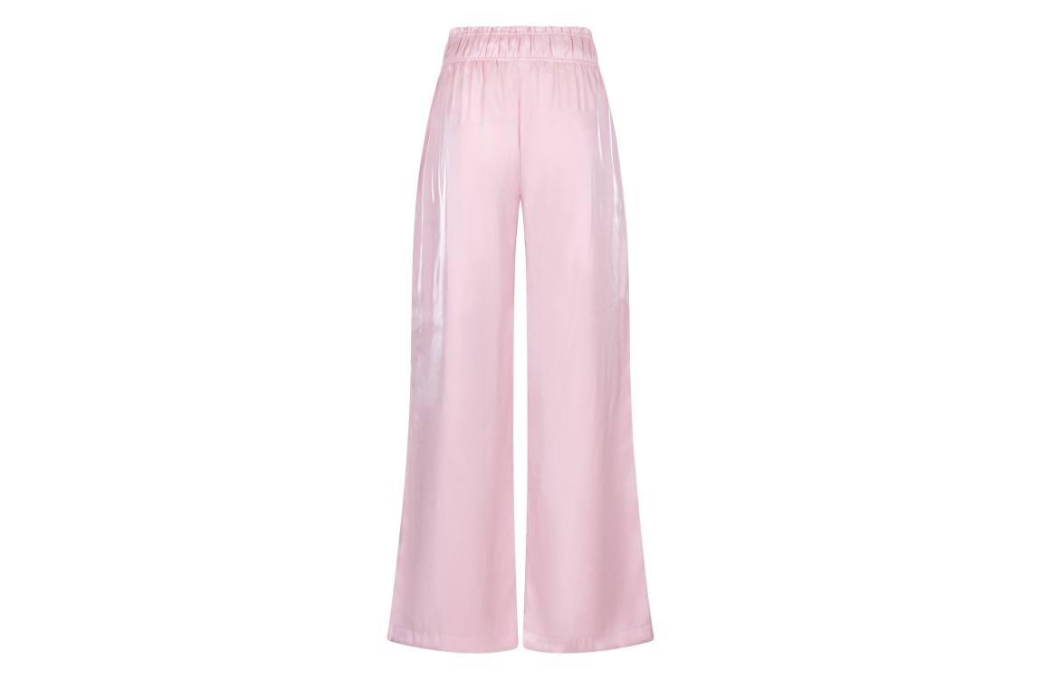 NUKUS Rubi Pants Shiny 30 blush. Dit wijdvallende model sluit door middel van een elastische tailleband. Deze roze broek van Nukus is voorzien van twee steekzakken aan de voorzijde. Dit model is bewerkt met een glans.