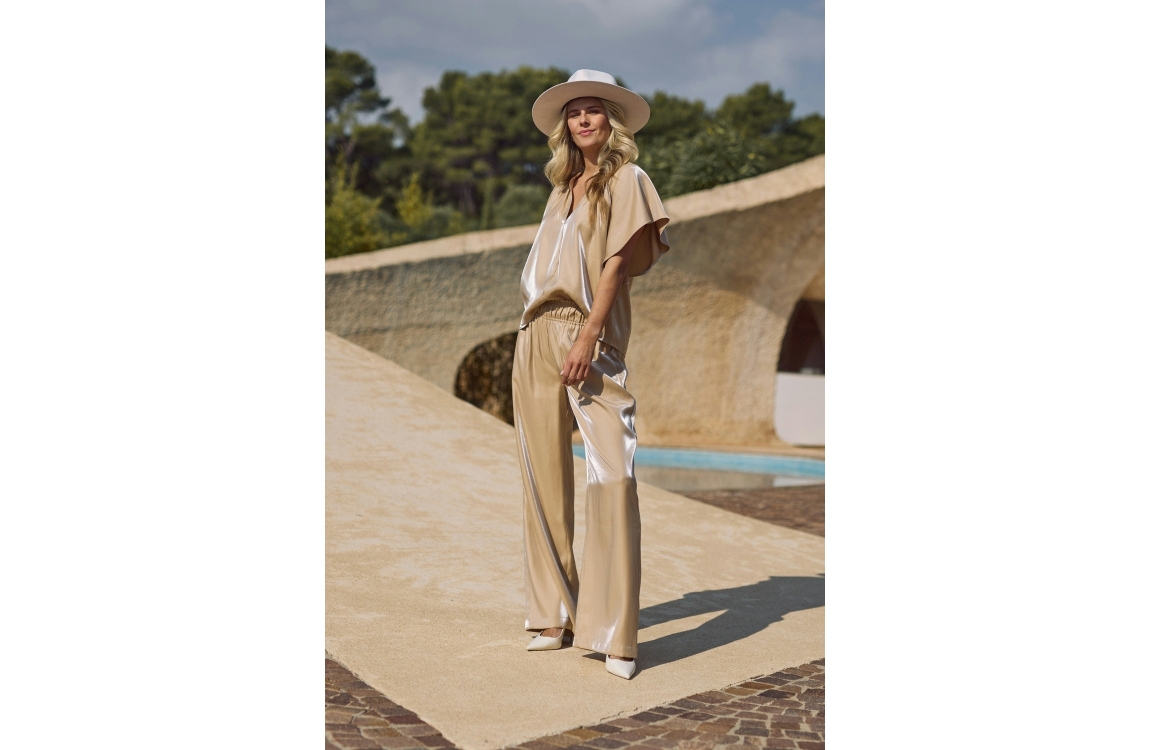 NUKUS Rubi Pants Shiny 9 sand. Dit wijdvallende model sluit door middel van een elastische tailleband. Deze bruine broek van Nukus is voorzien van twee steekzakken aan de voorzijde. Dit model is bewerkt met een glans.