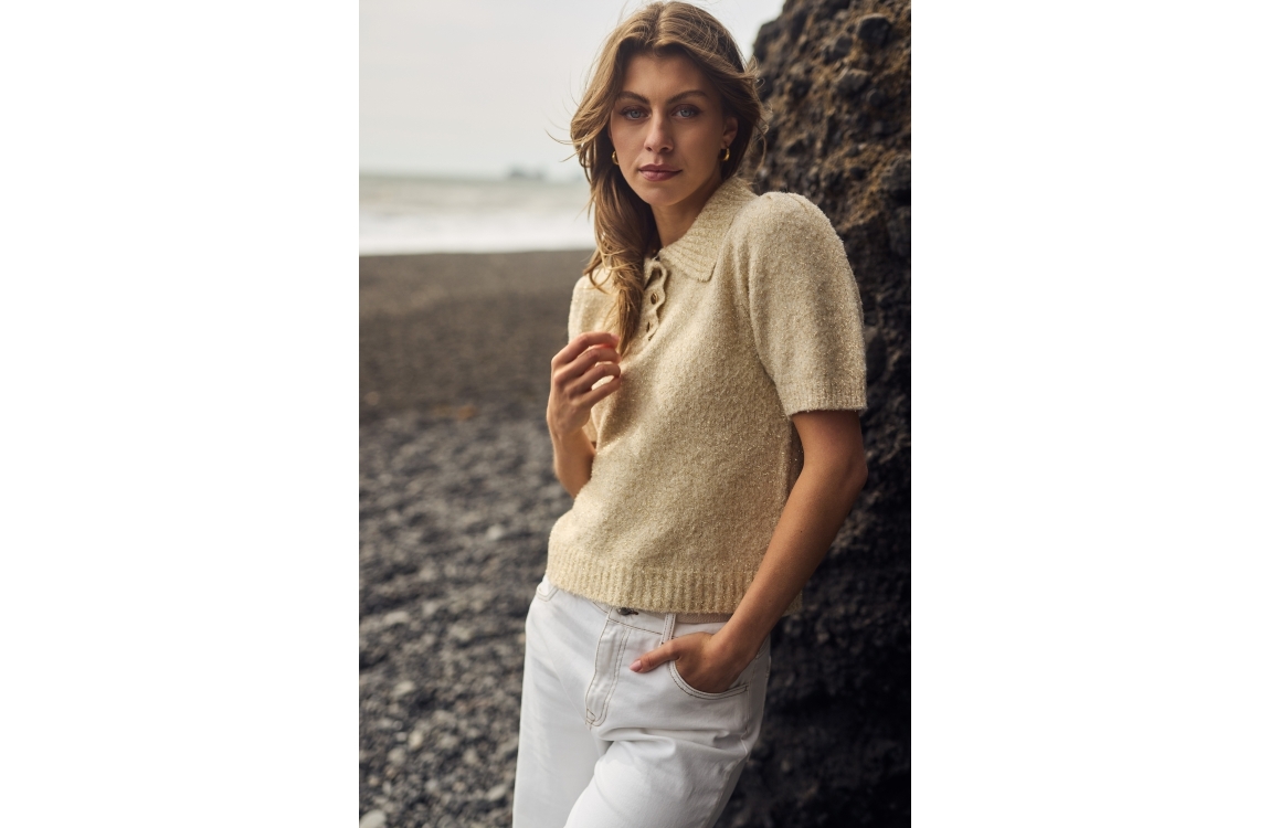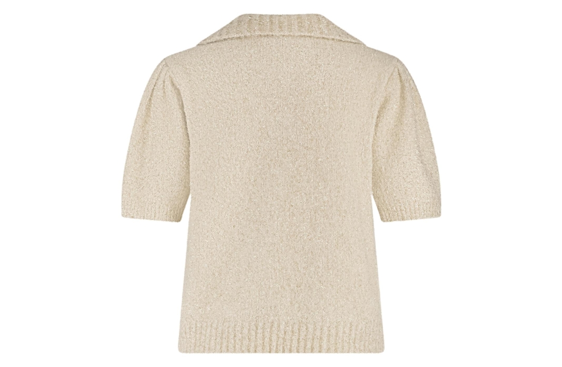 NUKUS Sandra Pullover 9 sand. Dit rechtvallende model heeft een kraag met knopen en korte mouwen. Deze beige pullover van Nukus is bewerkt met lurex draden. Dit model is afgewerkt met ribboorden.