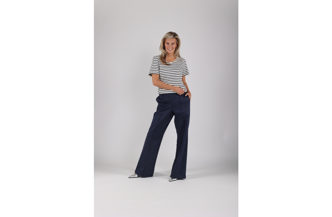 Nukus top Tirza NKS01088. Dit rechtvallend model is voorzien van een ronde hals bewerkt met een goudkleurig glitter randje en heeft korte mouwen. Deze navy/witte top van Nukus is bewerkt met strepen.
