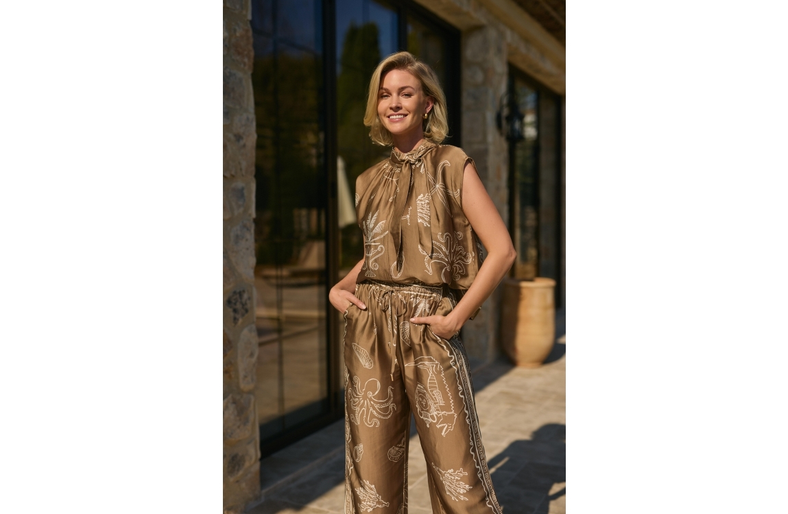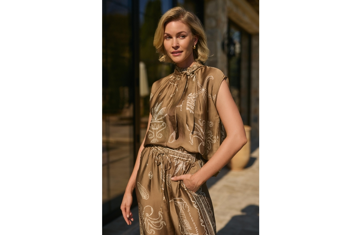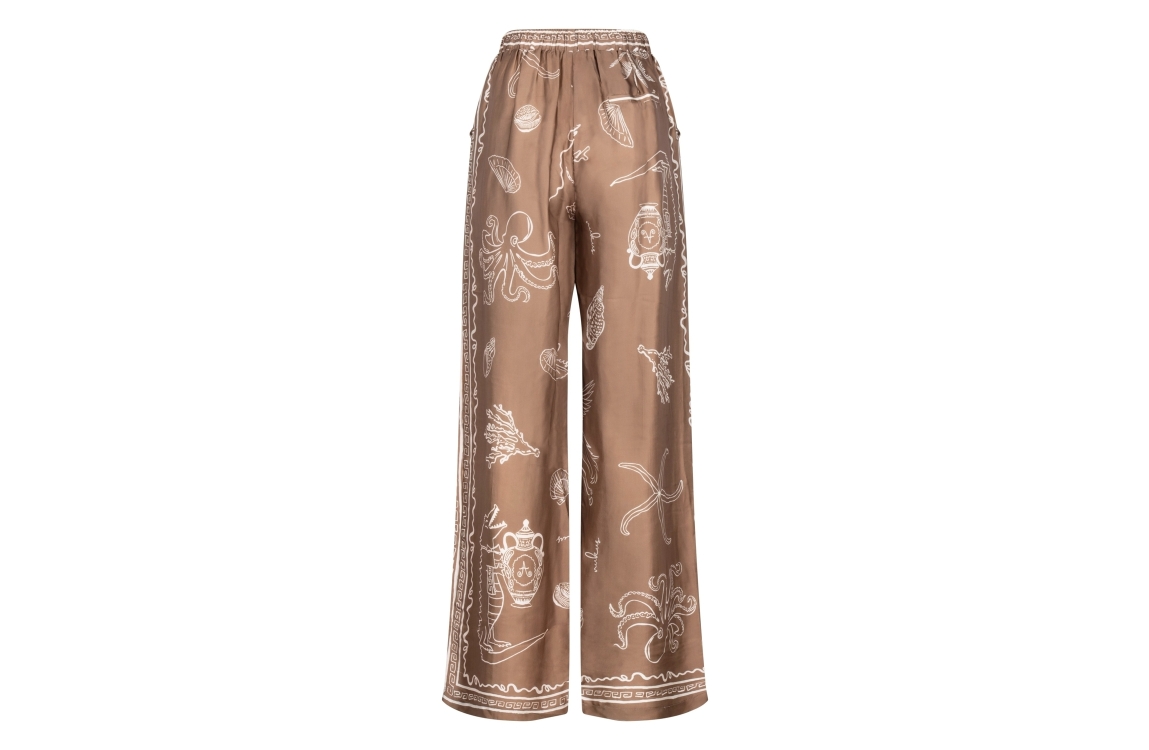 NUKUS broek NKS09106 273. Dit soepelvallende model sluit door middel van een elastische boord met trekkoord. Deze bruine broek van NUKUS is all-over bewerkt met een opdruk in zee-thema en is voorzien van twee steekzakken.