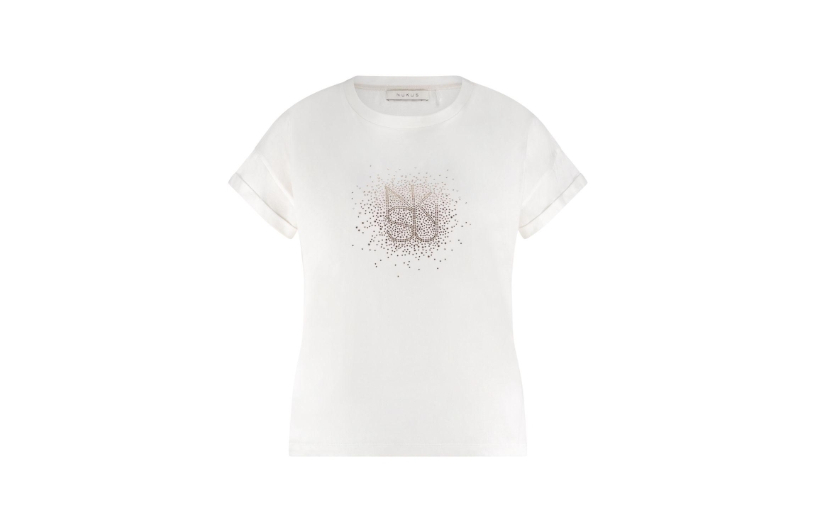 NUKUS Vilamoura Shirt NK Strass 17 off white. Dit rechtvallend model is voorzien van een ronde hals en heeft korte mouwen. Deze off white top van Nukus is aan de voorzijde bewerkt met strass steentjes in de vorm van het Nukus logo.