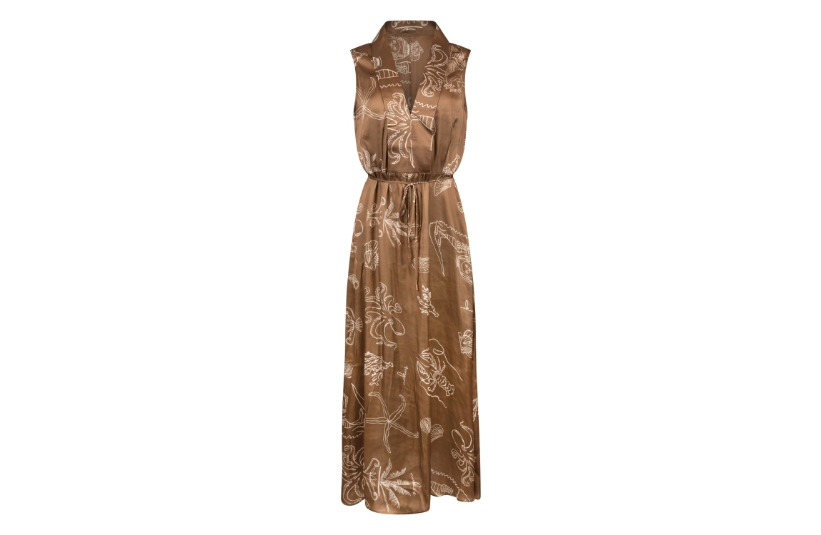 NUKUS jurk NKS14033 273. Dit rechtvallende model heeft een V-hals en is mouwloos. Deze bruine jurk van NUKUS is all-over bewerkt met een opdruk in zee-thema en is voorzien van een strikceintuur. Het model sluit door middel van een ritssluiting.