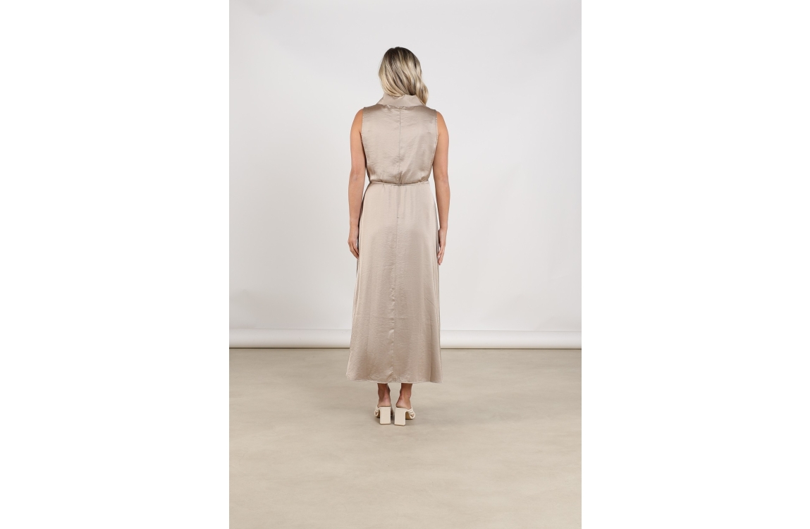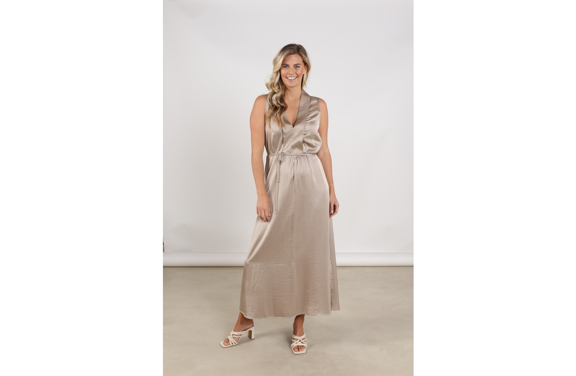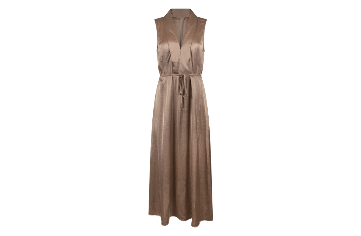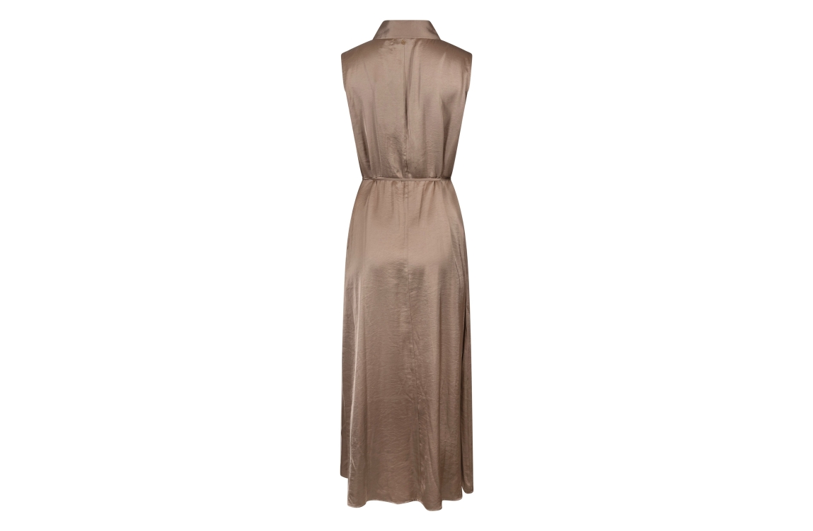 NUKUS Violet Dress Silky 65 fango. Dit rechtvallende model heeft een v-hals en is mouwloos. Deze bruine jurk van Nukus is voorzien van een blinde ritssluiting aan de zijkant en een trekkoord in de taille. Dit model is all-over bewerkt met een glans.