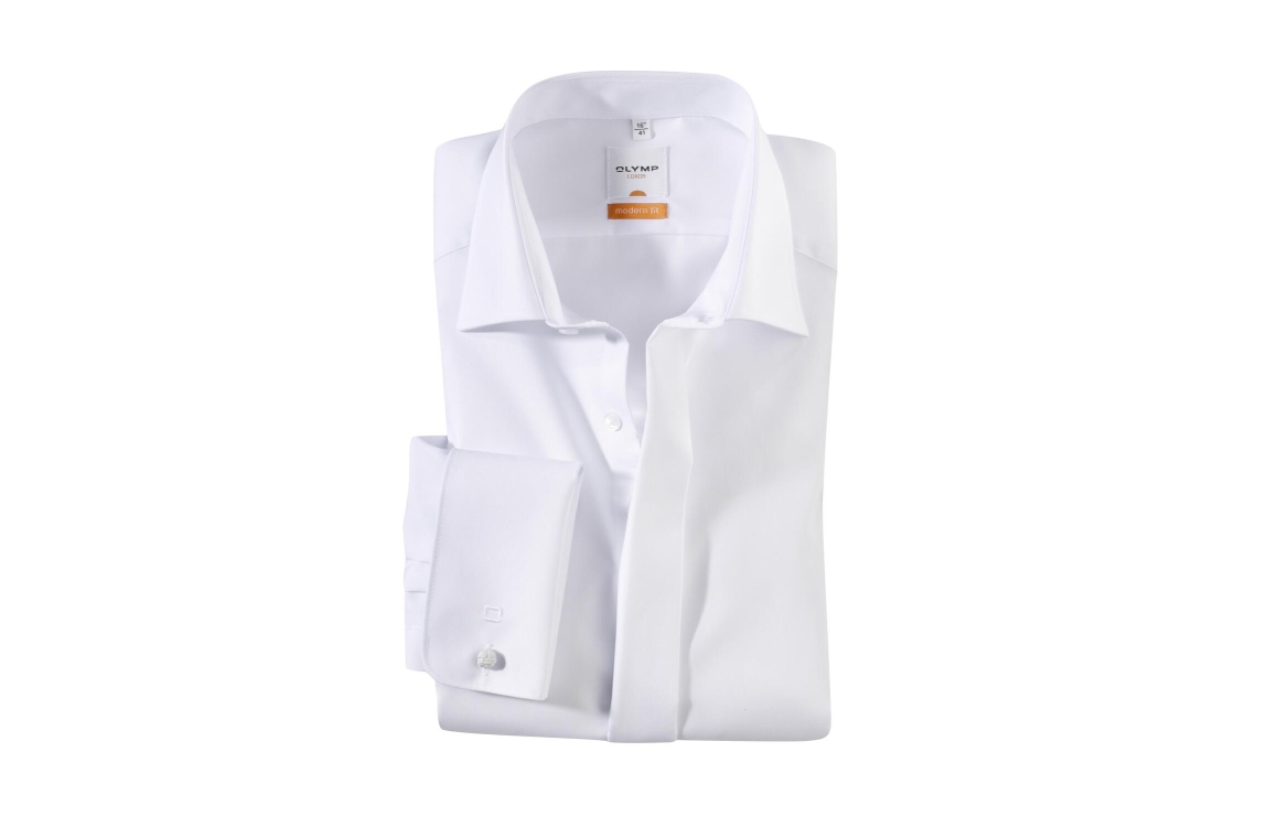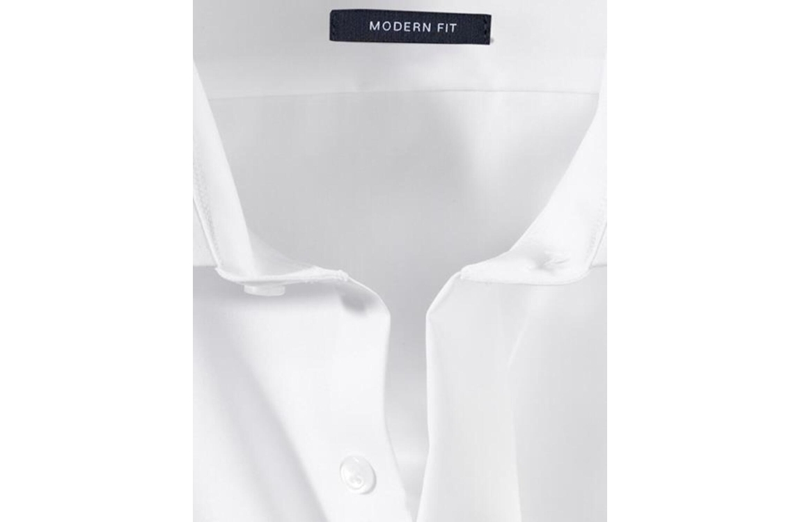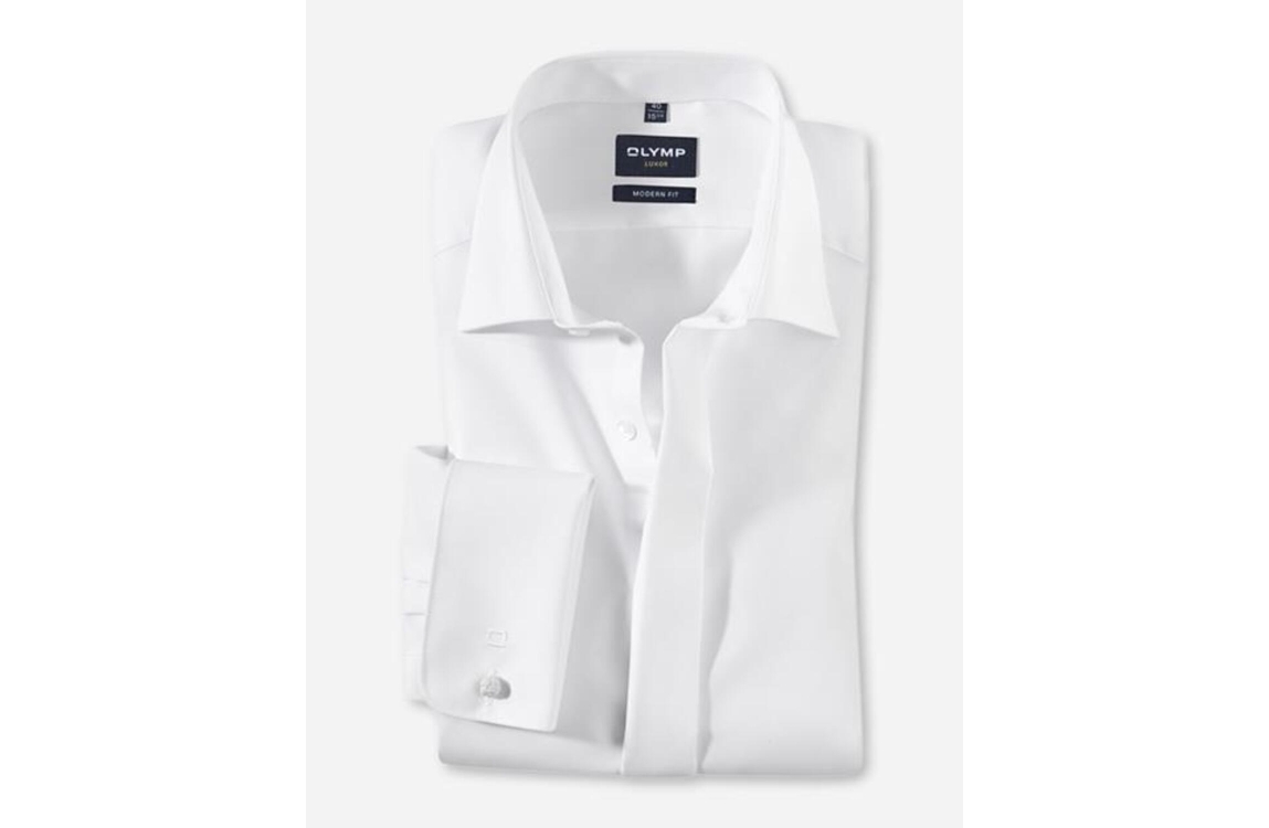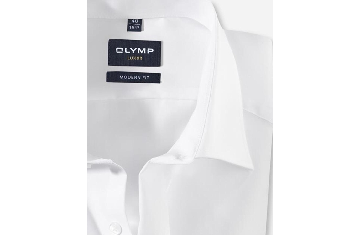 Olymp overhemd 046664. Dit modern fit model is voorzien van een New Kent kraag en heeft lange mouwen. Deze witte overhemd van Olymp sluit door middel van knoopjes.