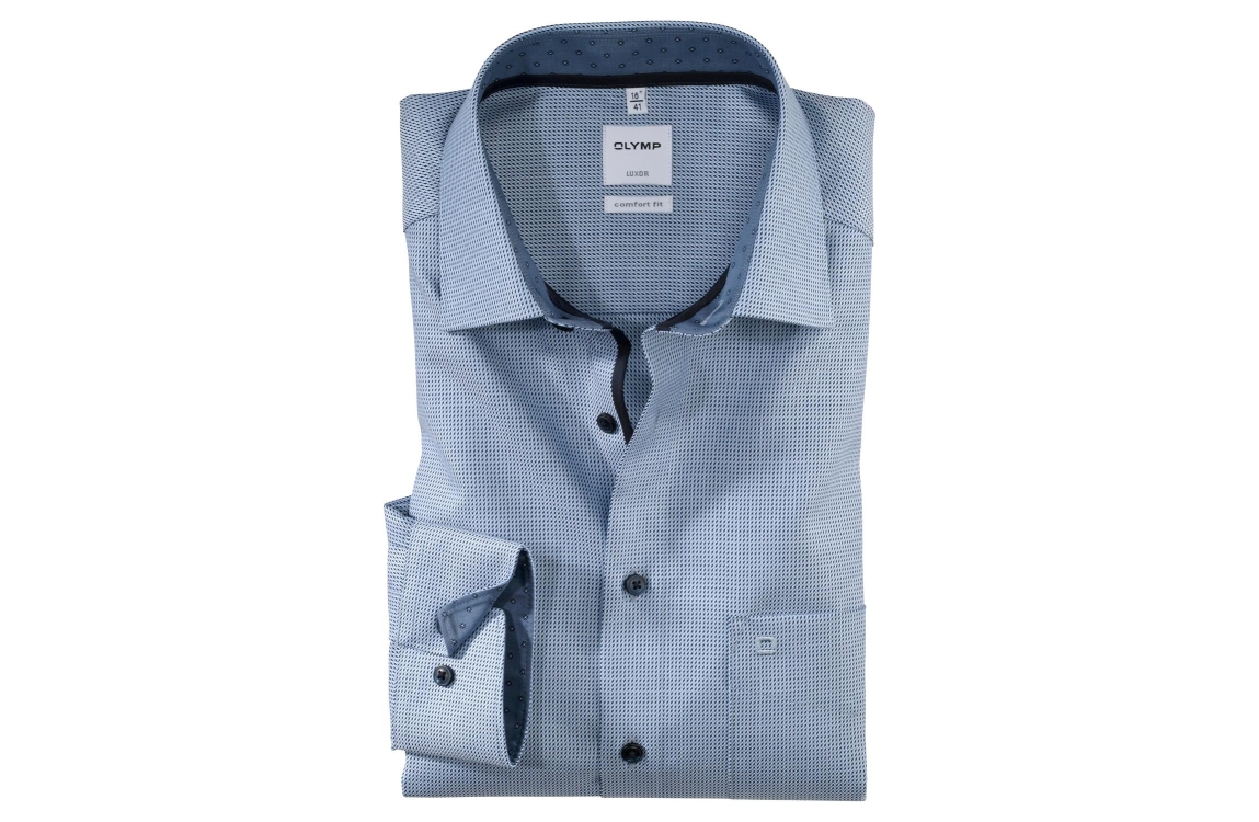 Olymp overhemd 1011/44/11. Deze modern fit model is voorzien van een kraag en heeft lange mouwen. Deze lichtblauwe overhemd van Olymp sluit door middel van knoopjes, is afgewerkt met een borstzakje en heeft een minimalistiche print in blauw tinten.