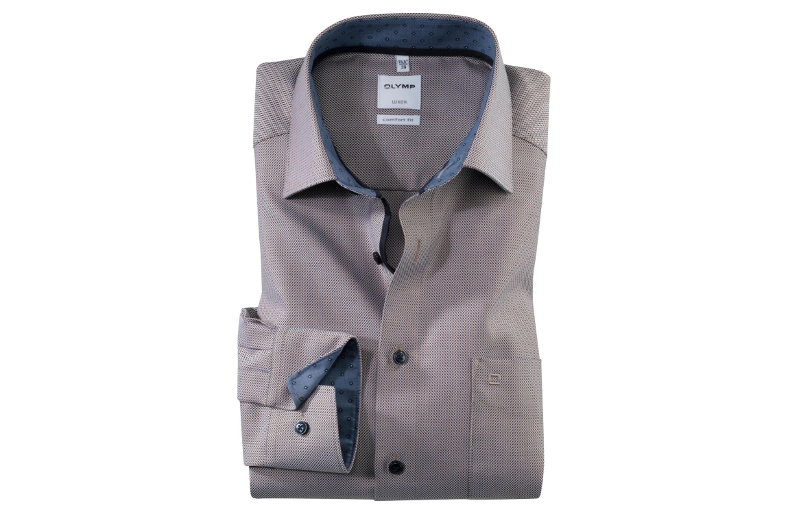 Olymp overhemd 1011/44/28. Deze modern fit model is voorzien van een kraag en heeft lange mouwen. Dit beige overhemd van Olymp sluit door middel van knoopjes, is afgewerkt met een borstzakje en heeft een minimalistiche print in bruin tinten.