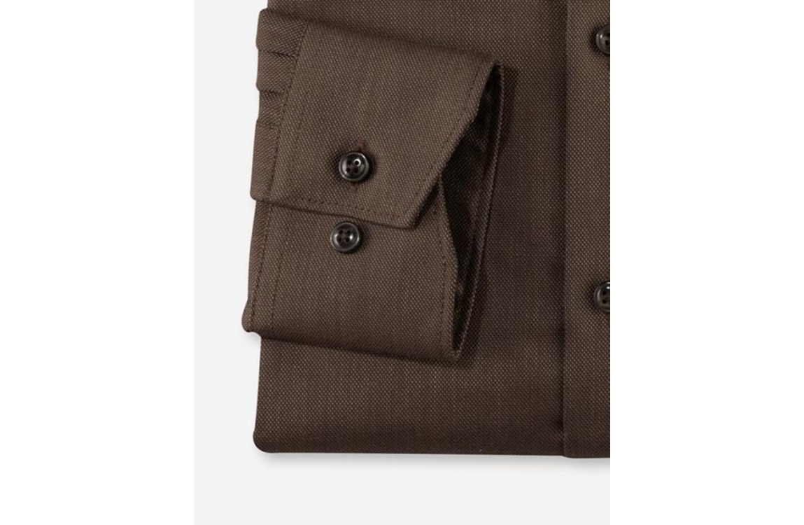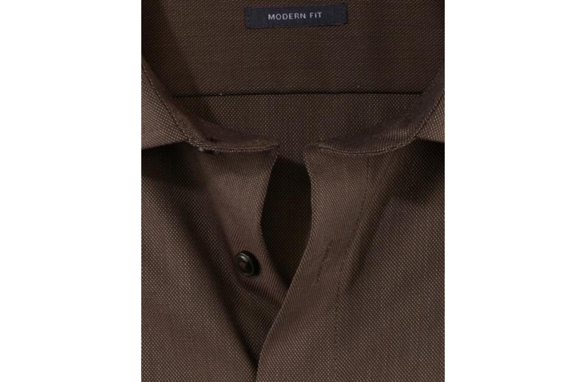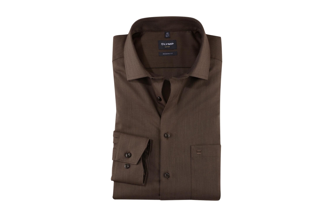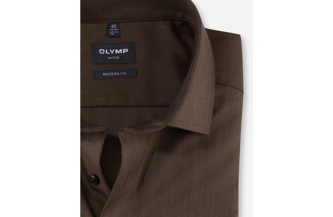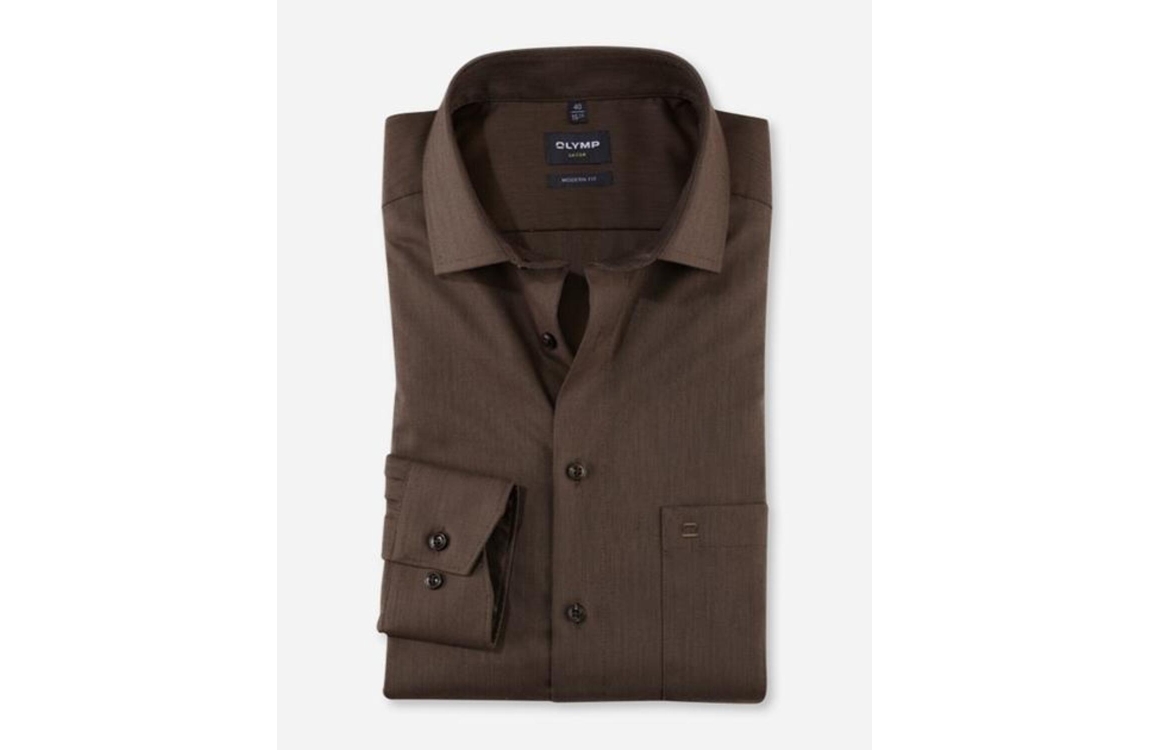 Olymp Luxor overhemd 1340. Dit Modern fit model sluit door middel van knopen en is voorzien van een New-Kentkgraag en heeft lange mouwen. Dit donkerbruine overhemd van Olymp heeft een nauwsluitende pasvorm, bewegingsvrijheid en heeft ademende eigenschappen. Dit model is een business jersey model.