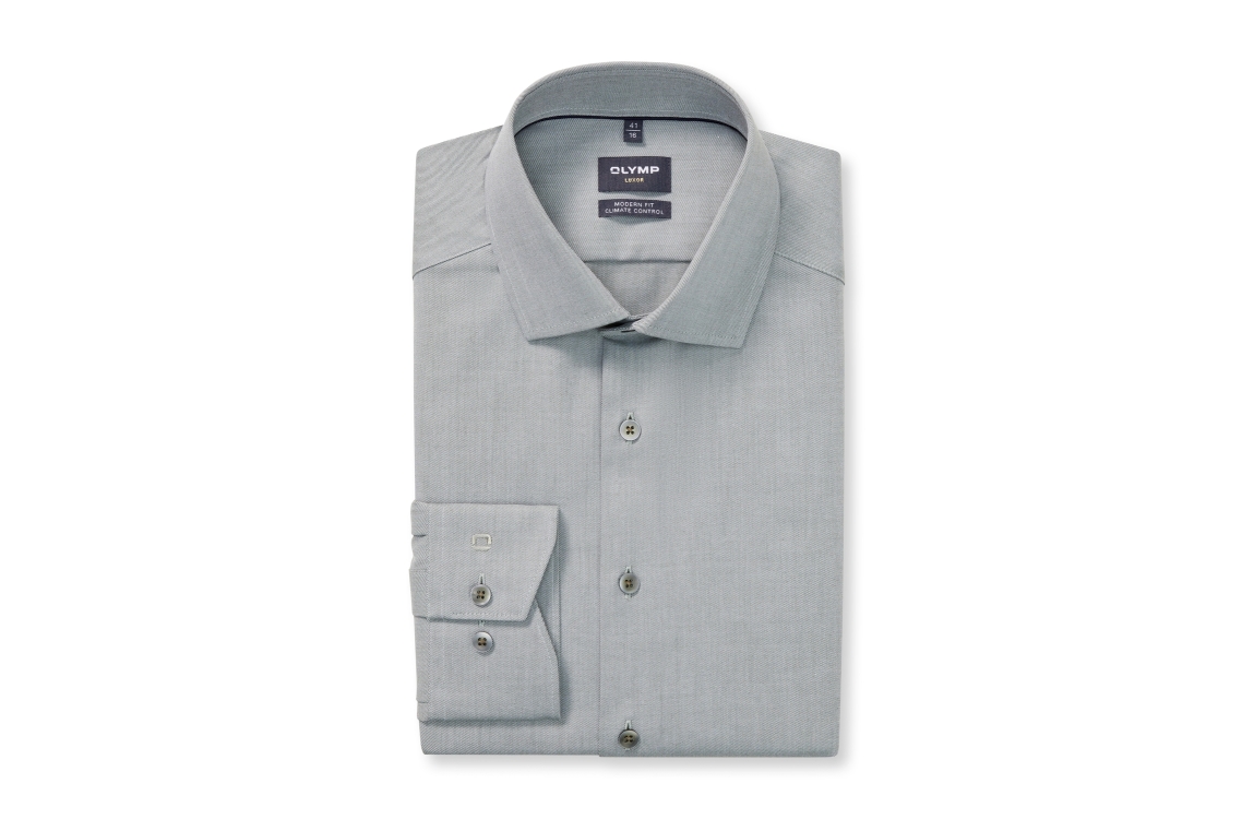 Olymp overhemden 123024-hemden. Dit modern fit model heeft een kraag, lange mouwen en sluit door middel van knopen. Dit groen grijze overhemd van Olymp is gemaakt van een non-iron materiaal.