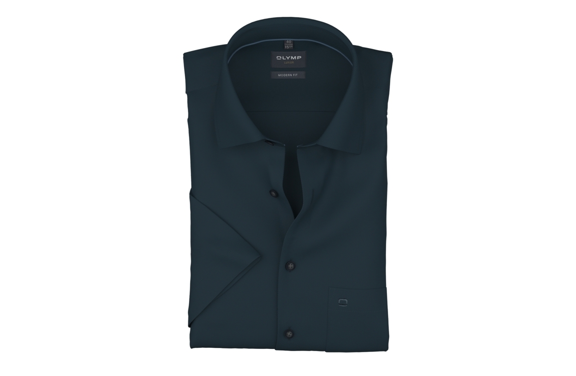 Olymp overhemd 124612. Dit modern fit is voorzien van een kraag en heeft korte mouwen. Deze donkerblauwe overhemd van Olymp sluit door middel van knopen en beschikt over een borstzak.