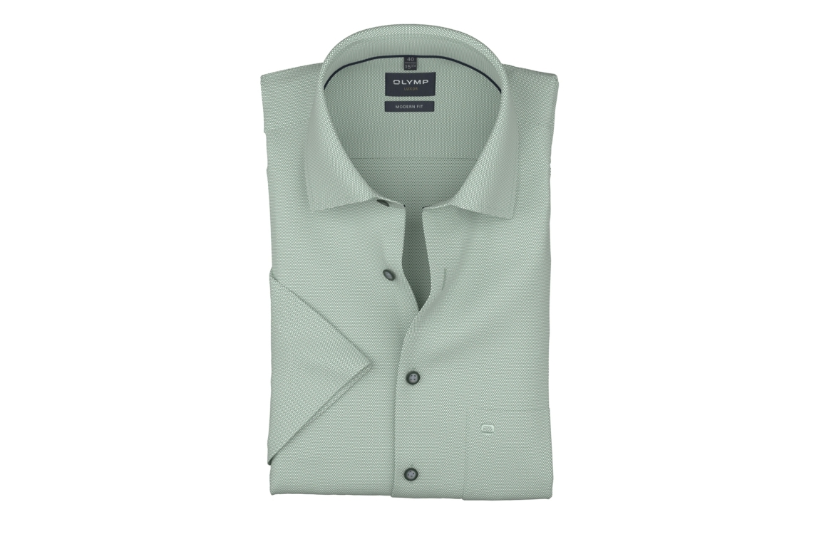 Olymp overhemd 124612. Dit modern fit is voorzien van een kraag en heeft korte mouwen. Deze groene overhemd van Olymp sluit door middel van knopen en beschikt over een borstzak. Dit model is all-over bewerkt met een fijne print.