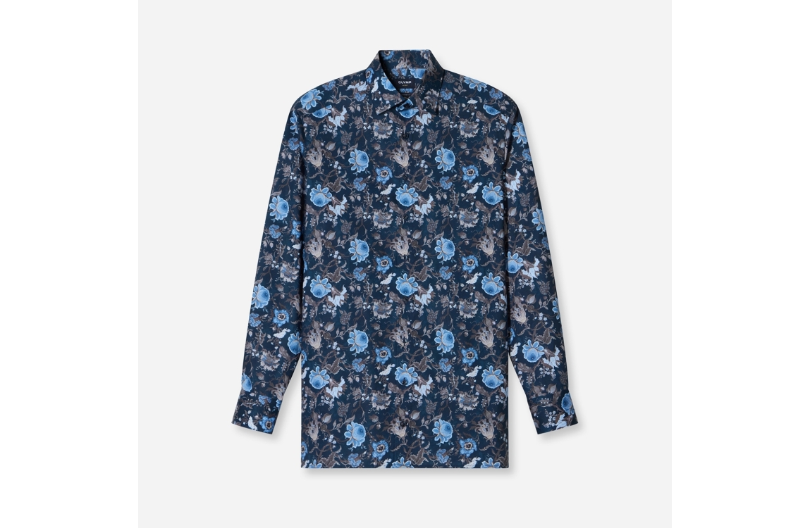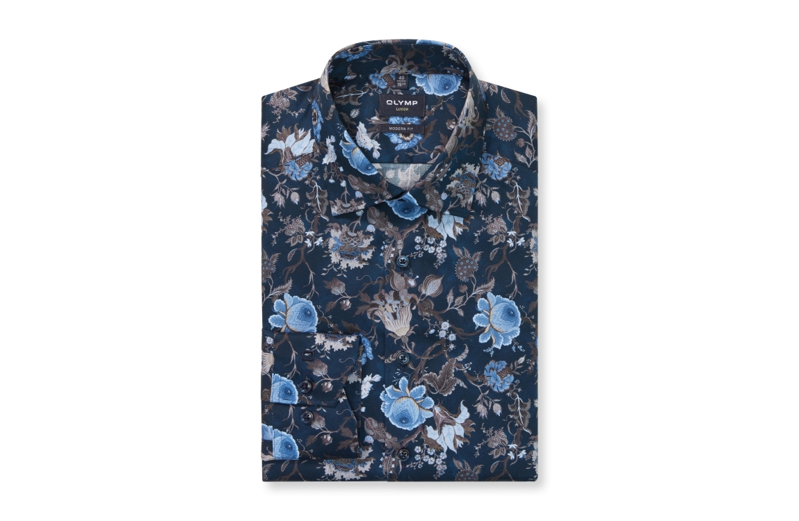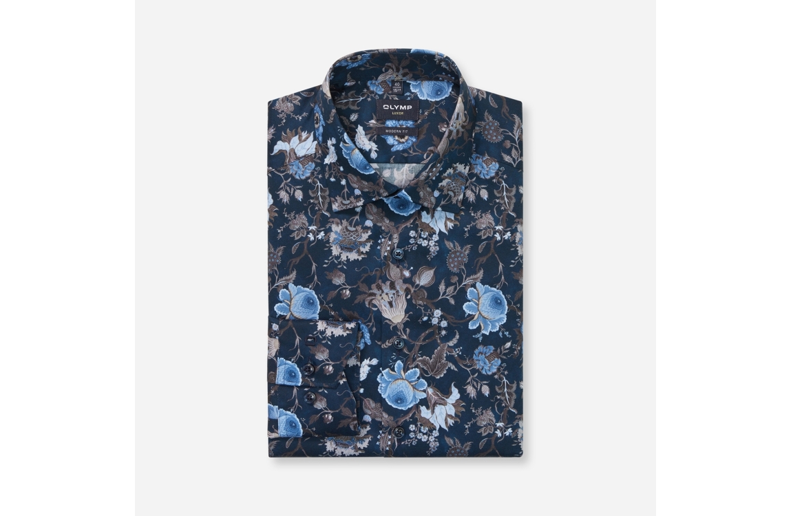 Olymp 124884-Hemden 18. Dit modern fit model heeft een kraag en lange mouwen. Dit donker blauwe overhemd van Olymp is all-over bewerkt met een print en sluit aan de voorzijde door middel van knopen.
