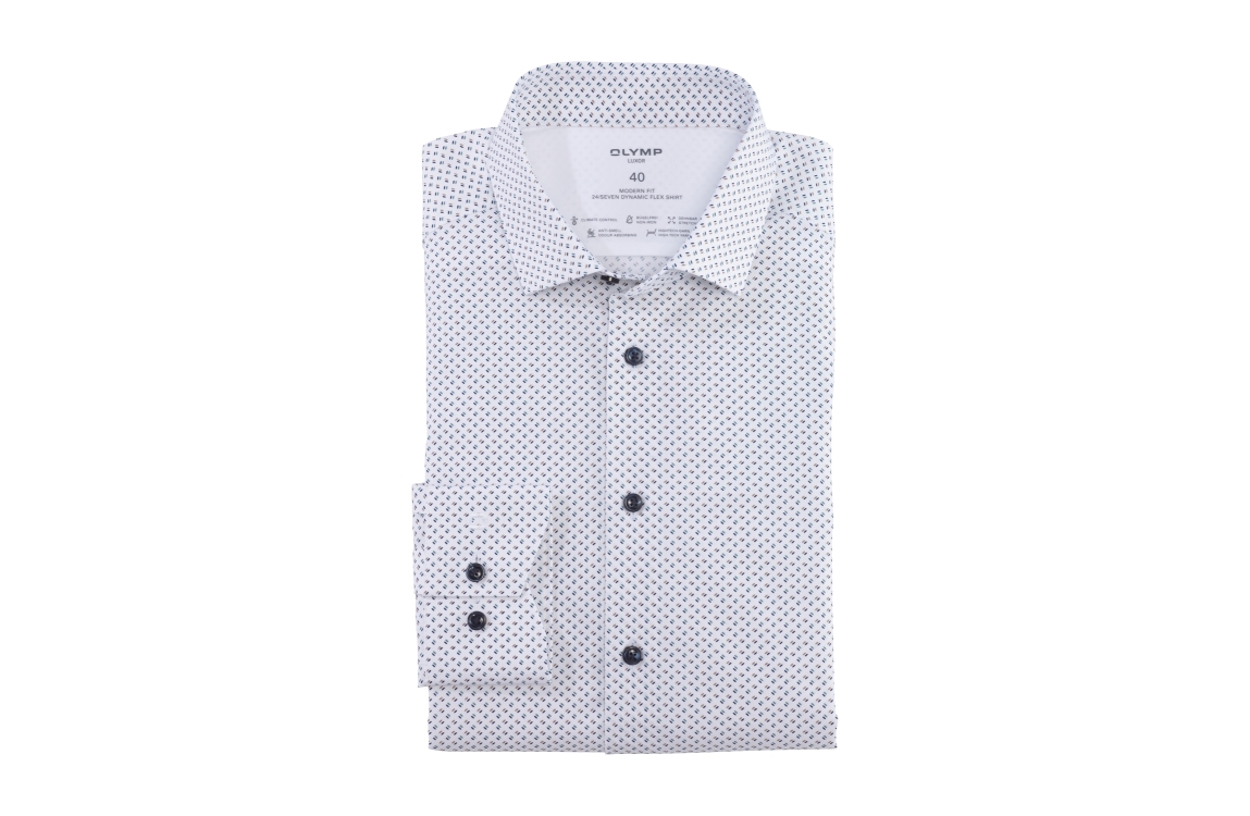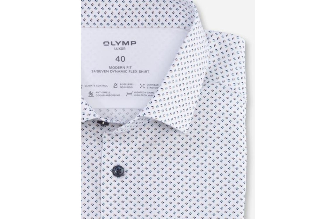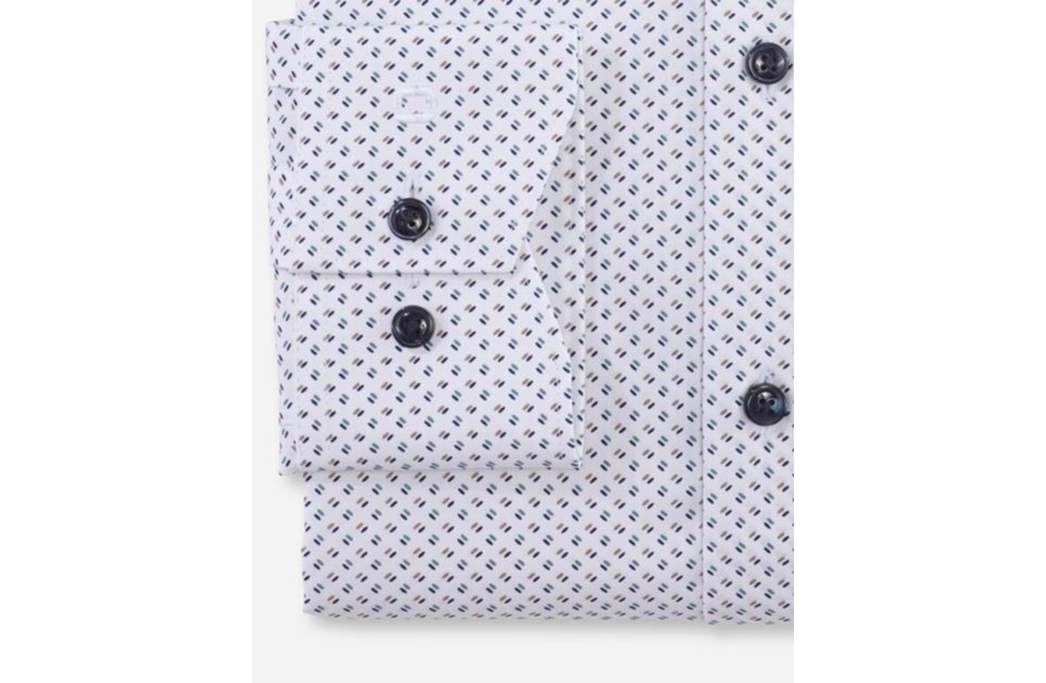 Olymp overhemd 1251/44/45. Deze modern fit model is voorzien van een kraag en heeft lange mouwen. Deze witte overhemd van Olymp sluit door middel van knoopjes, is afgewerkt met een borstzakje en heeft een minimalistiche print in groen tinten.