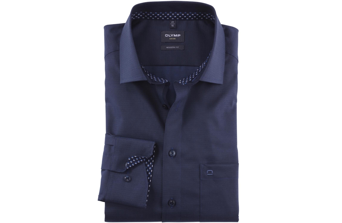 Olymp overhemd Luxor 12624914. Dit modern fit model is voorzien van een kraag en heeft lange mouwen. Deze donkerblauwe overhemd van Olymp sluit door middel van knopen en is all-over bewerkt met een lichte ruitpatroon. Dit model is afgewerkt met een borstzak en heeft een extra langer armlengte.
