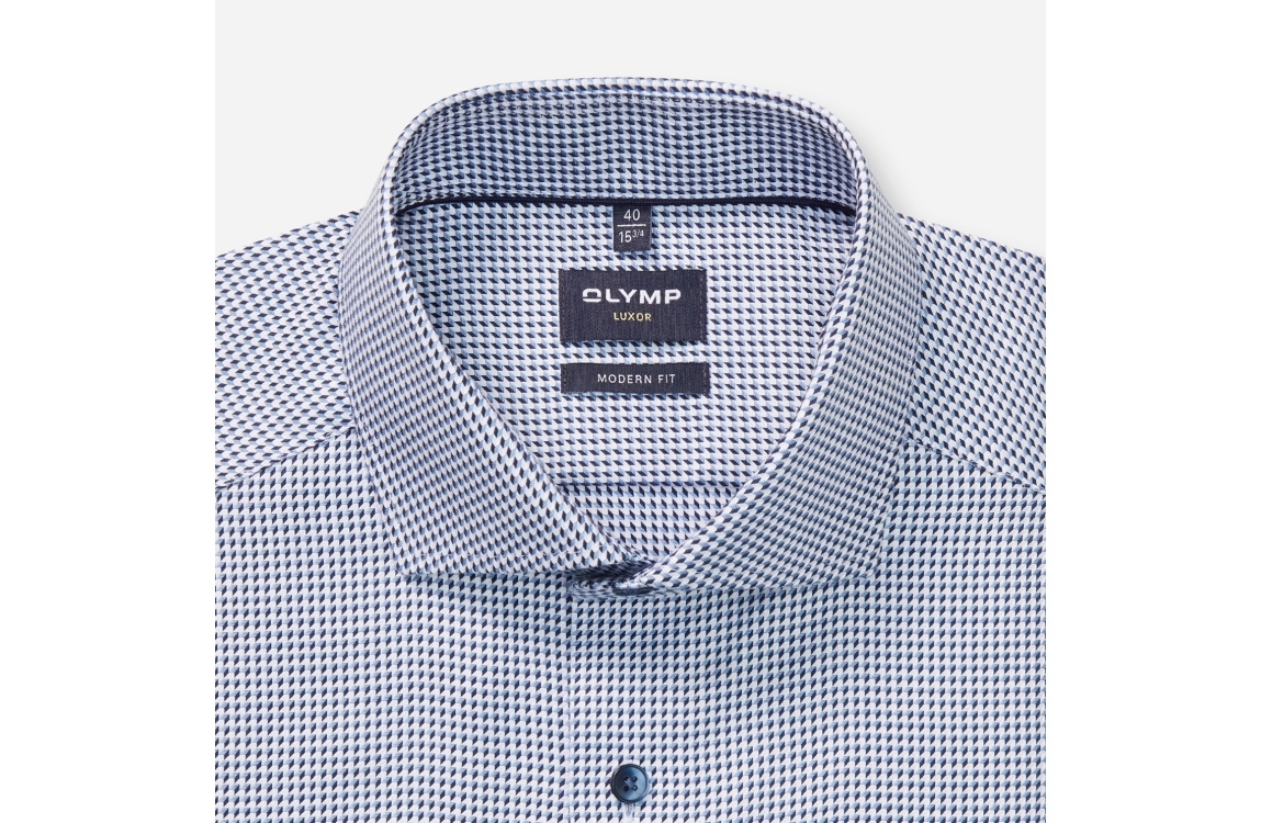 Olymp overhemd 129284. Dit modern fit model heeft een kraag en lange mouwen. Deze witte overhemd van Olymp is all-over bewerkt met een blauwe print en sluit aan de voorzijde door middel van knopen.