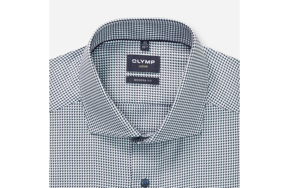 Olymp overhemd 129284. Dit modern fit model heeft een kraag en lange mouwen. Deze witte overhemd van Olymp is all-over bewerkt met een groene/blauwe print en sluit aan de voorzijde door middel van knopen.