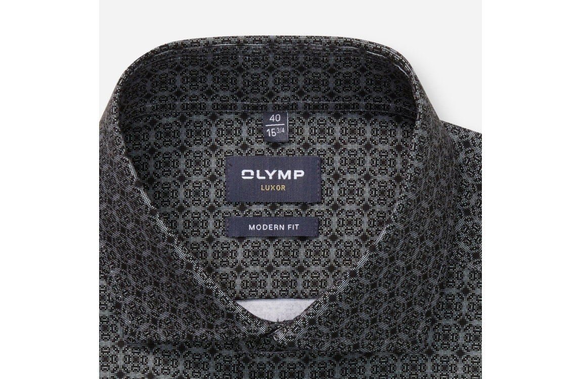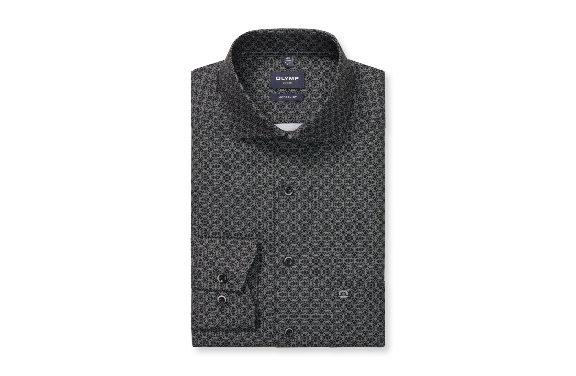 Olymp overhemd 129884 63. Dit modern fit model heeft een kraag en lange mouwen. Deze donkergrijze overhemd van Olymp sluit aan de voorzijde door middel van knopen en is all-over bewerkt met een grafische print in een lichtere tint. Het model is voorzien van een borstzak.