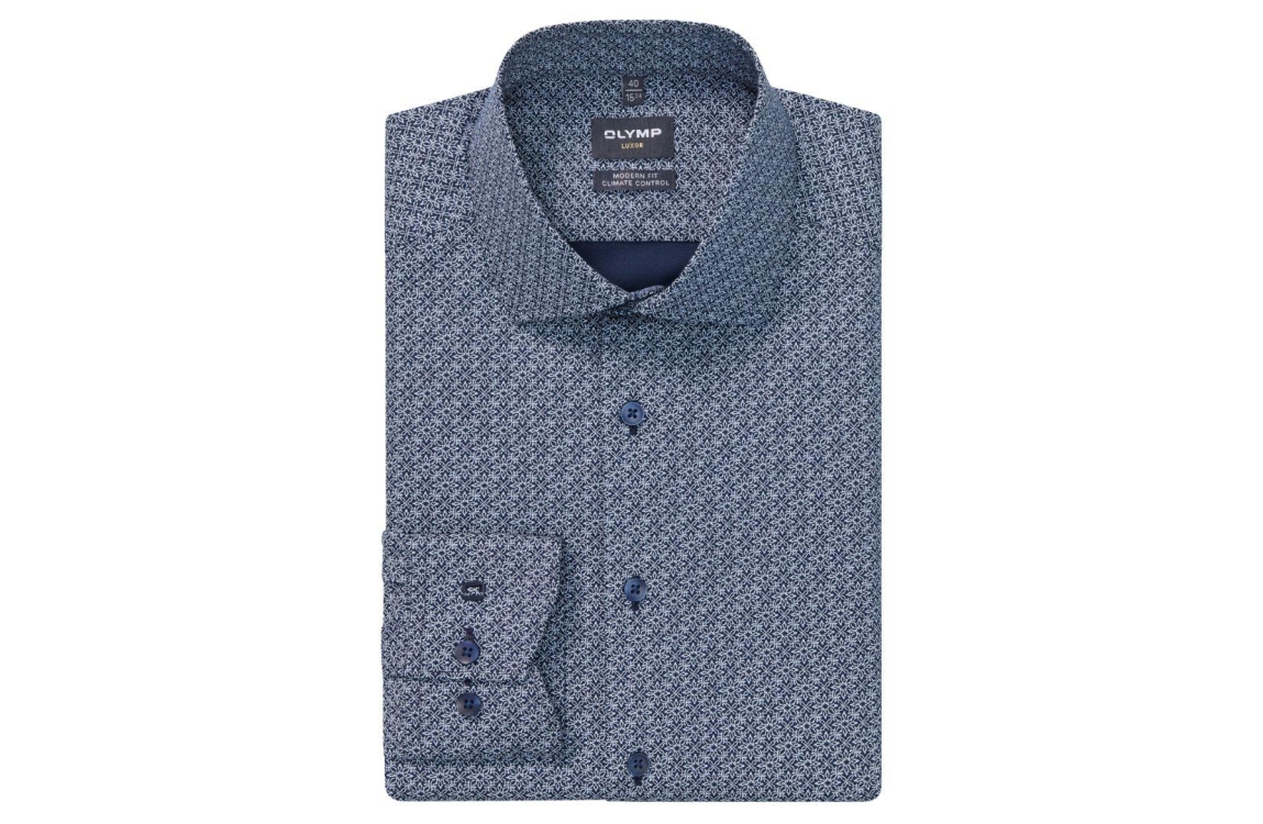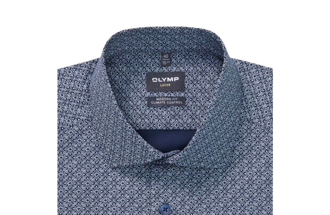 Olymp Luxor overhemd 130884 18. Dit modern fit model sluit door middel van knopen en heeft een new-kent kraag en lange mouwen. Deze donkerblauwe overhemd van Olymp heeft een all-over print met een nauwsluitende pasvorm, bewegingsvrijheid en heeft ademende eigenschappen.