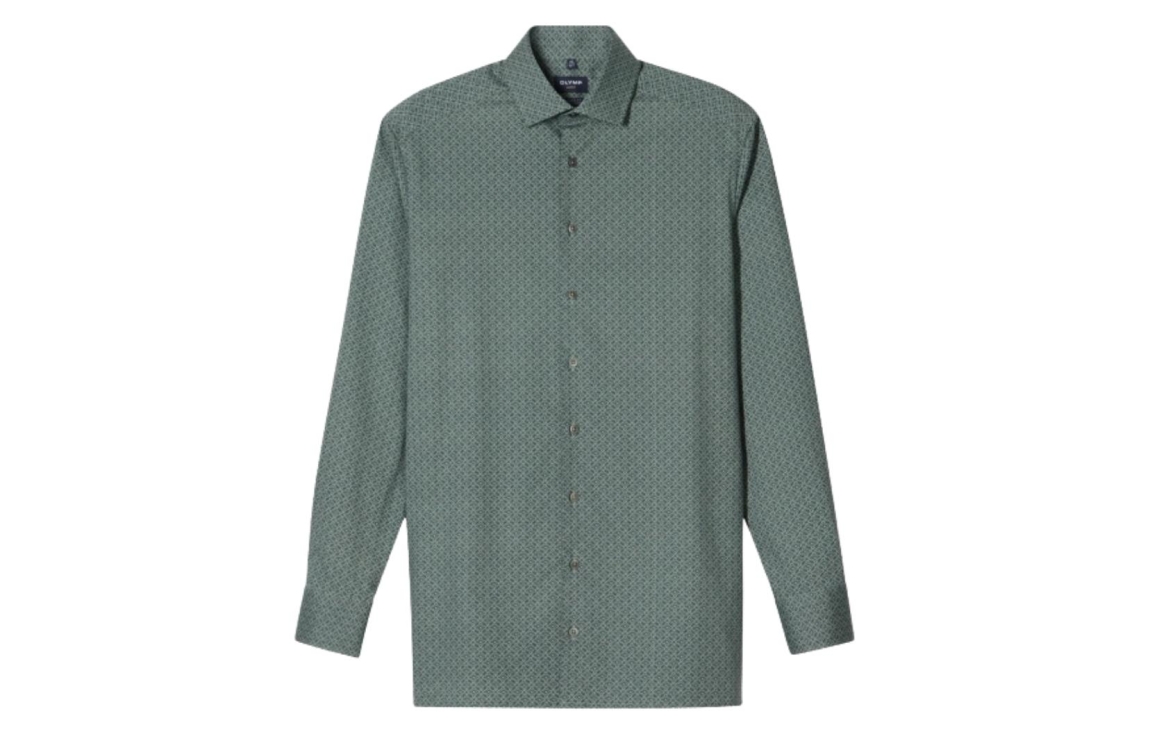 Olymp Luxor overhemd 130884. Dit modern fit model sluit door middel van knopen en is voorzien van een New-Kent kraag en heeft lange mouwen. Dit met een allover print grijze overhemd van Olymp heeft een nauwsluitende pasvorm, bewegingsvrijheid en heeft ademende eigenschappen.