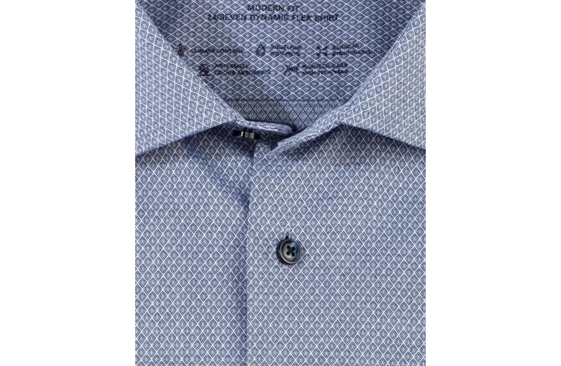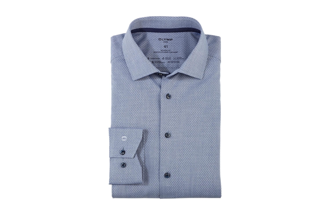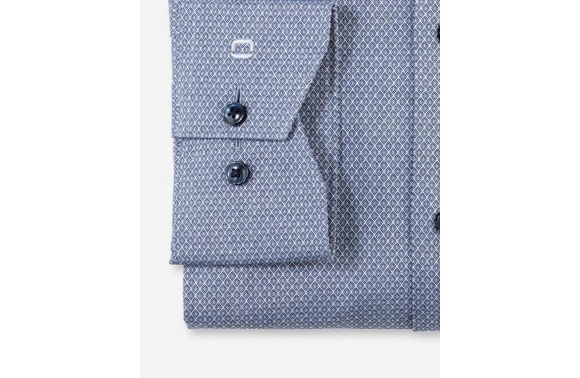 Olymp Luxor overhemd 1312. Dit modern fit model sluit door middel van knopen en is voorzien van een New-Kent kraag en heeft lange mouwen. Dit met een allover print blauwe overhemd van Olymp heeft een nauwsluitende pasvorm, bewegingsvrijheid en heeft ademende eigenschappen.