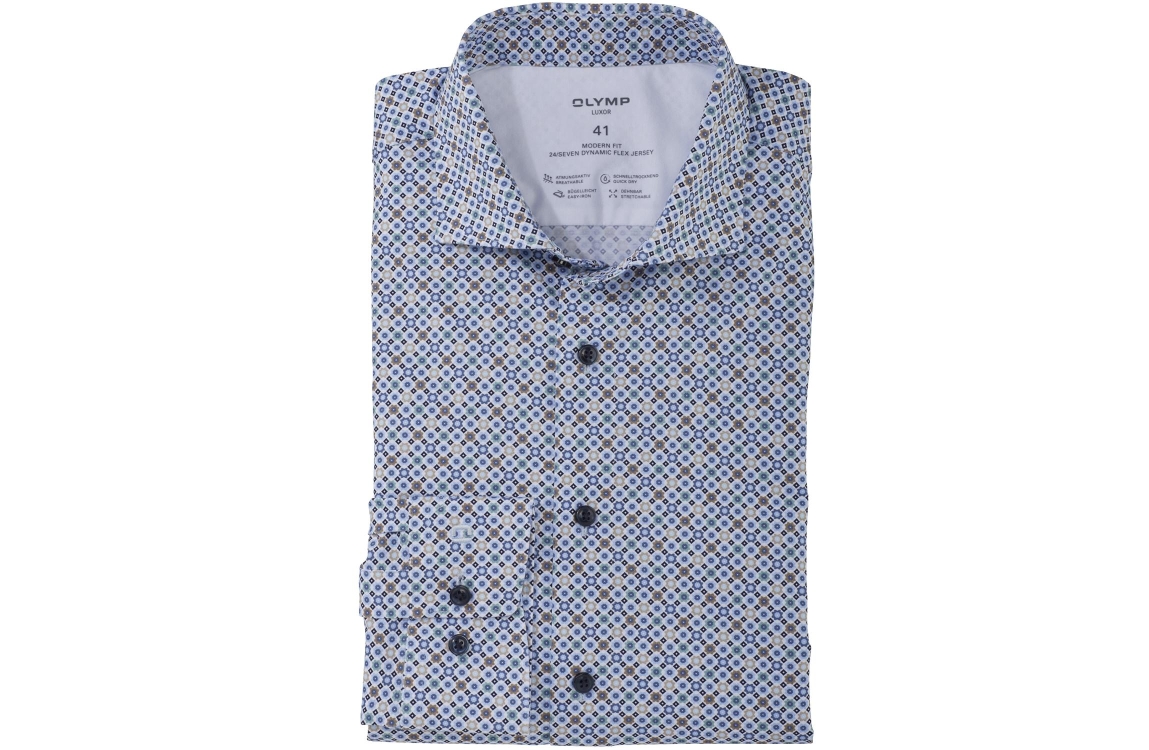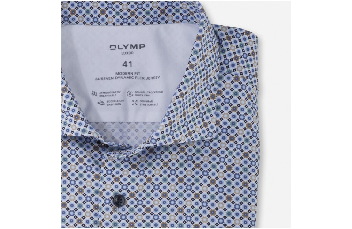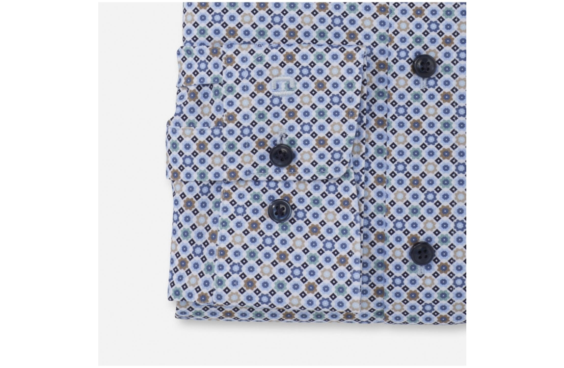 Olymp Luxor overhemd 1330|54|45. Dit modern fit model is voorzien van een Kent kraag en heeft lange mouwen. Dit blauwe overhemd sluit door middel van knopen en is bewerkt met een all-over bloem met ruit patroon in de kleuren blauw, bruin en groen.