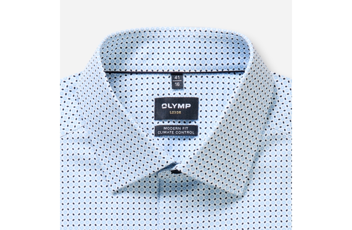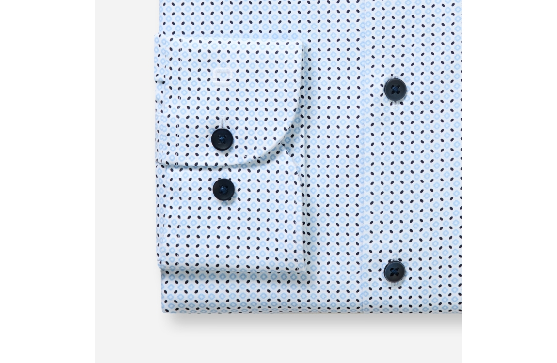 Olymp overhemd 133814. Dit modern fit is voorzien van een kraag en heeft lange mouwen. Deze blauwe overhemd van Olymp sluit door middel van knopen. Dit model is all-over bewerkt met een print en bevat stretch.