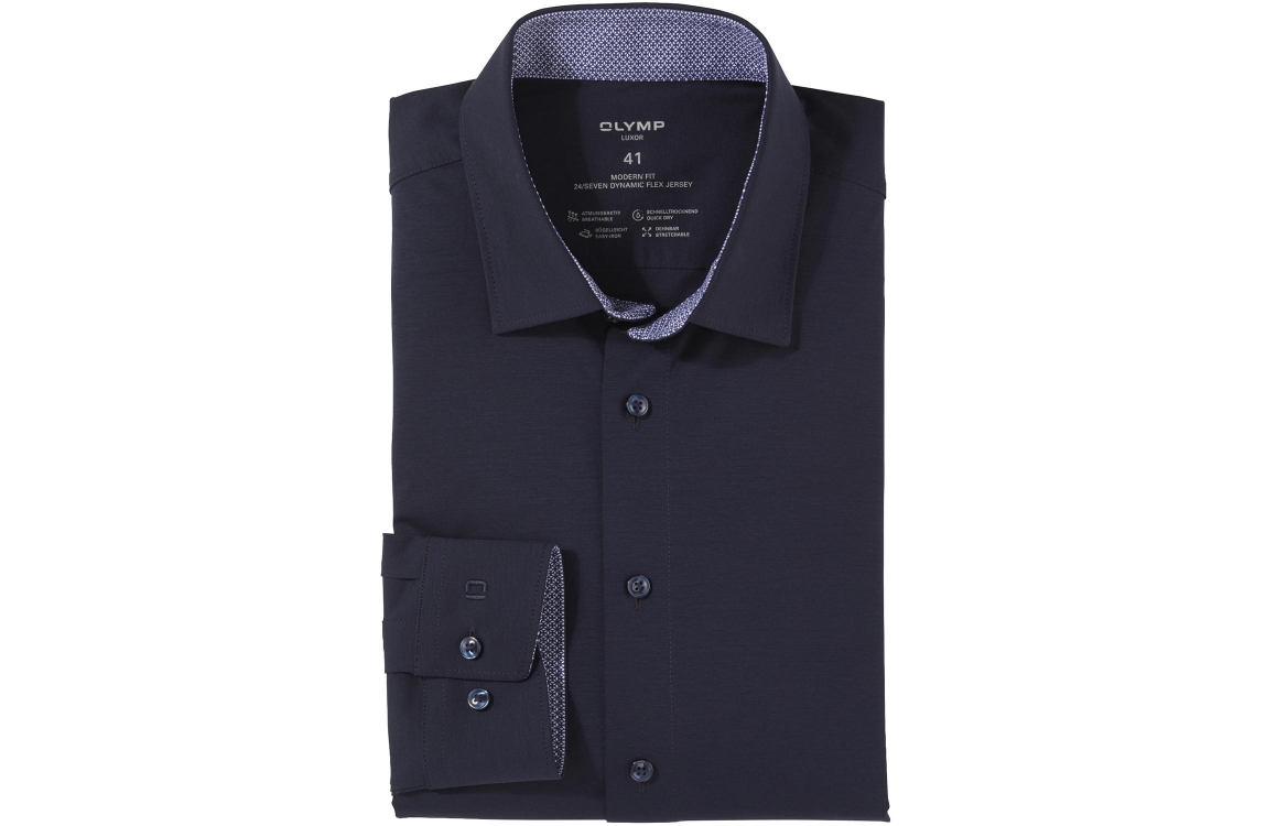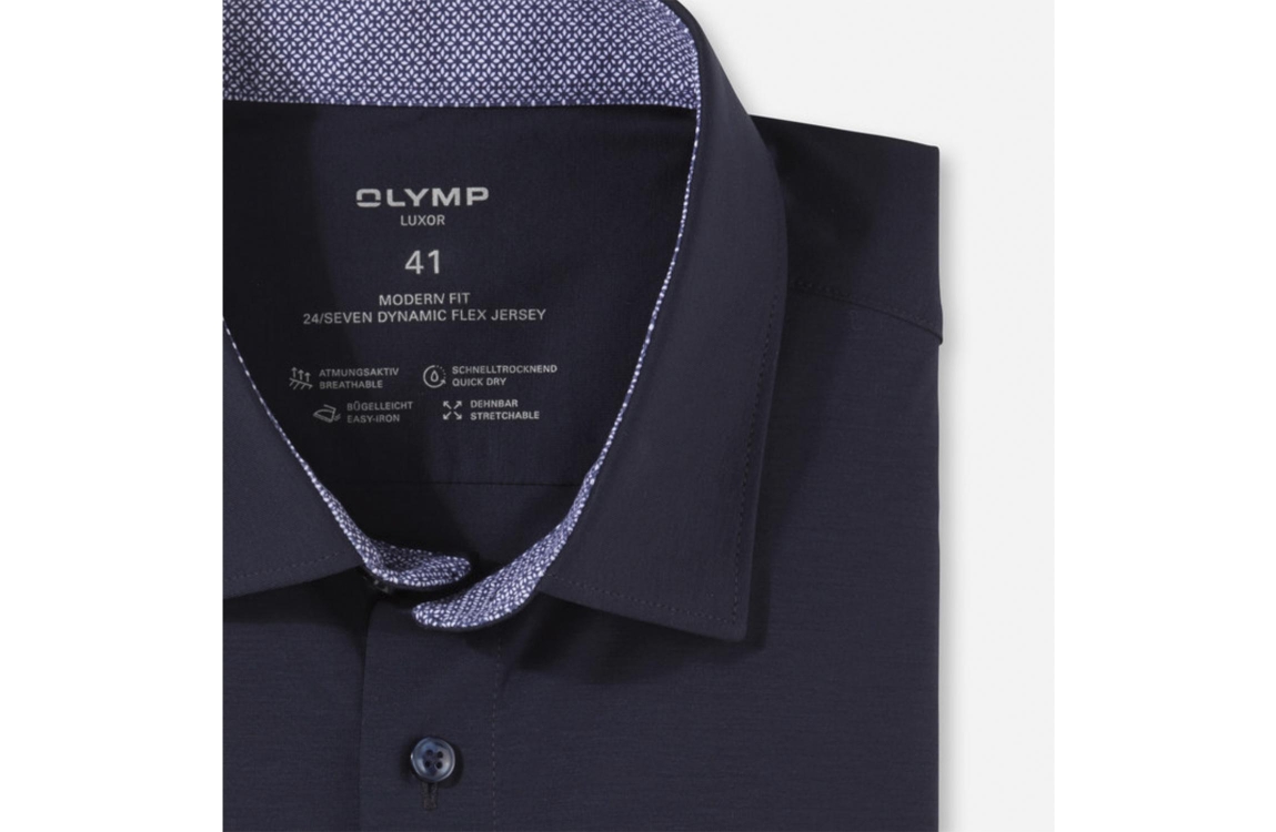 Olymp Luxor overhemd 1340. Dit Modernfit model sluit door middel van knopen en is voorzien van een New-Kentkgraag en heeft lange mouwen. Dit blauwe overhemd van Olymp heeft een nauwsluitende pasvorm, bewegingsvrijheid en heeft ademende eigenschappen. Dit model is een business jersey model.