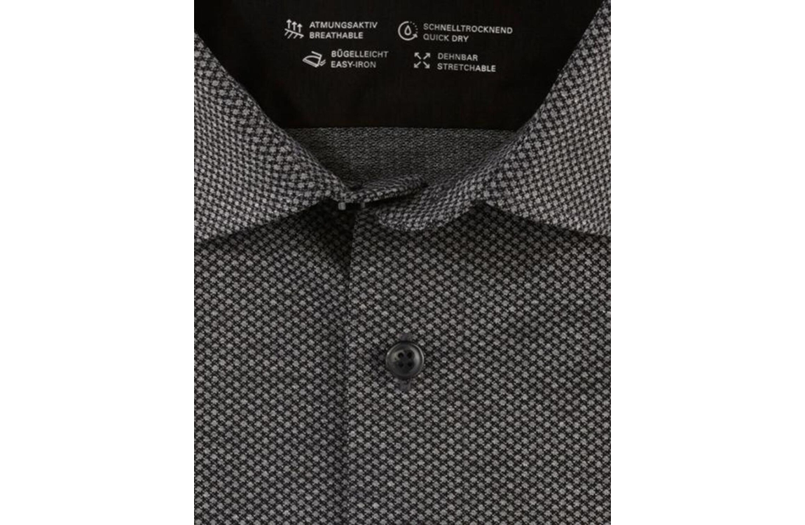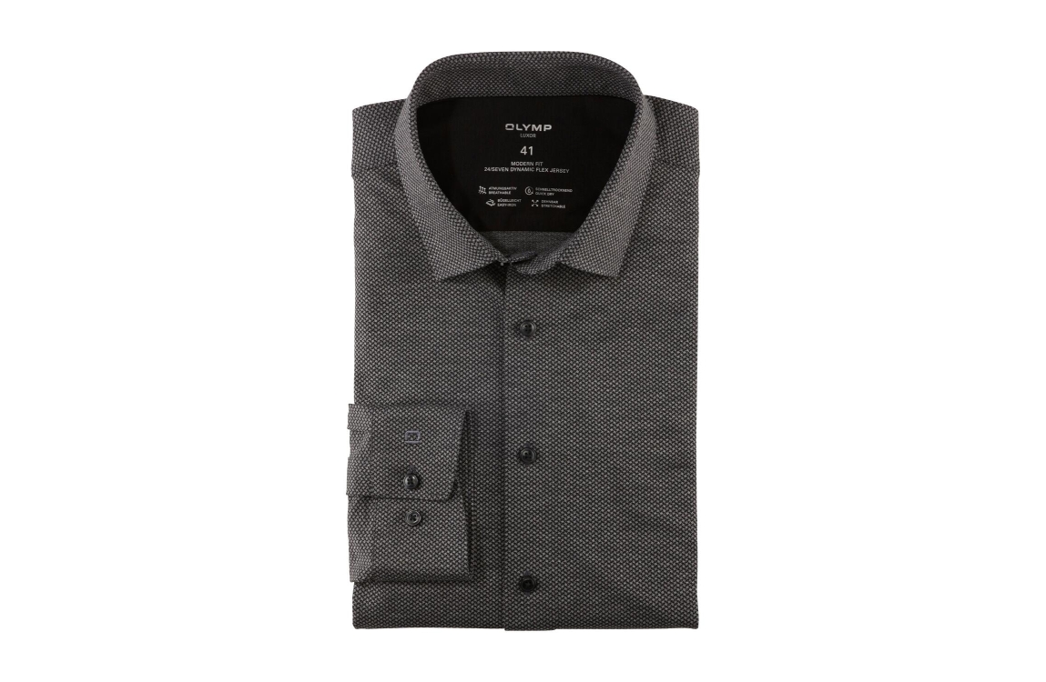 Olymp Luxor overhemd 1362. Dit modern fit model sluit door middel van knopen en is voorzien van een New-Kent kraag en heeft lange mouwen. Dit met een allover print grijze overhemd van Olymp heeft een nauwsluitende pasvorm, bewegingsvrijheid en heeft ademende eigenschappen.