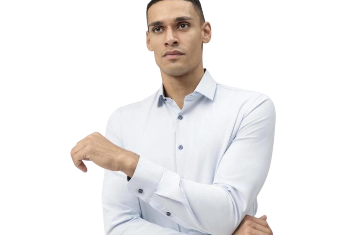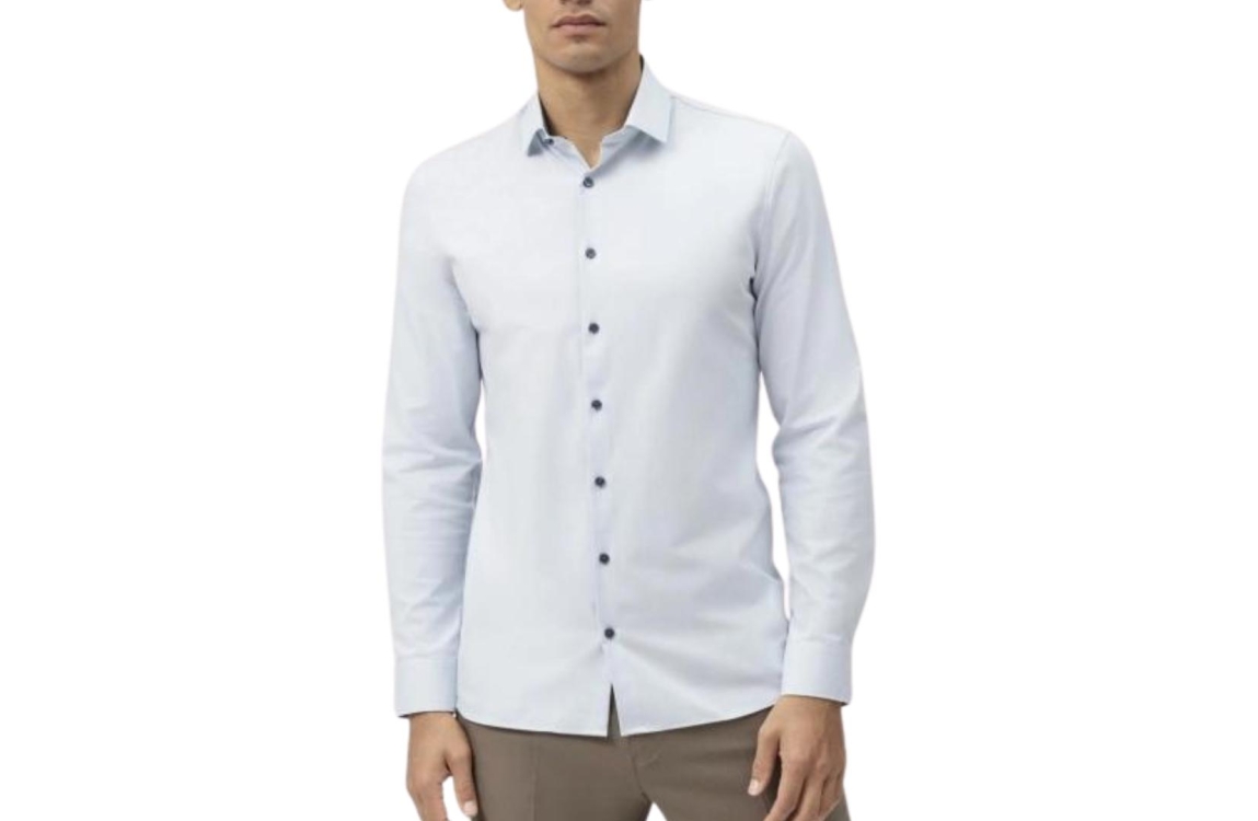 Olymp overhemd 2554|54|11. Dit super slim fit model is voorzien van een kraag en heeft lange mouwen afgewerkt met twee knopen. Dit blauwe overhemd van Olymp sluit door middel van knopen en is bij de kraag afgewerkt met donkere bies.