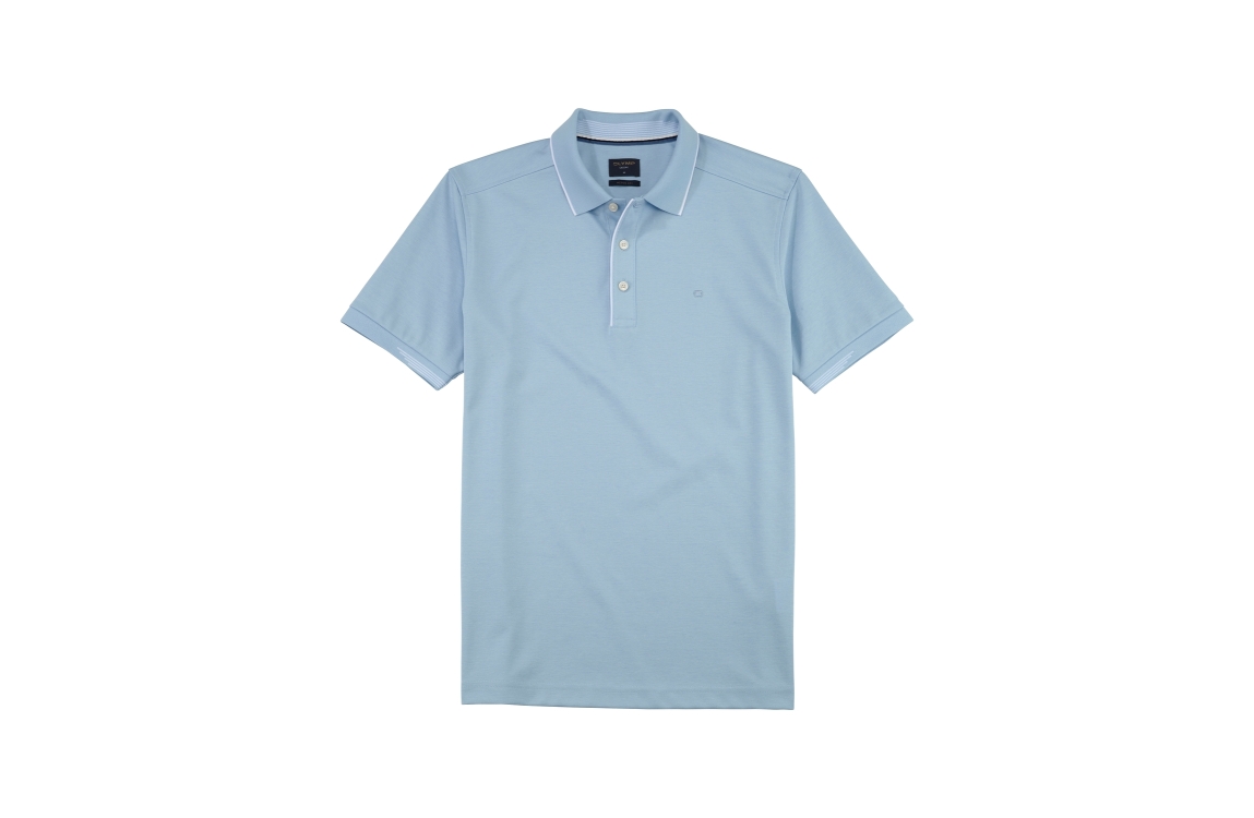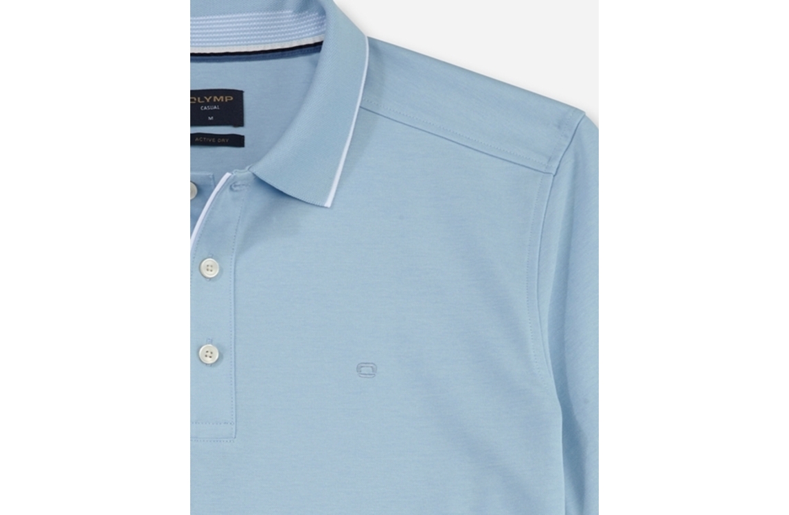 Olymp polo 530172. Dit rechtvallend model heeft een kraag en korte mouwen. Deze lichtblauwe polo van Olymp is doormiddel van knopen te sluiten en is afgewerkt met een witte boorden.