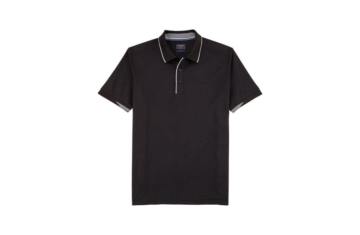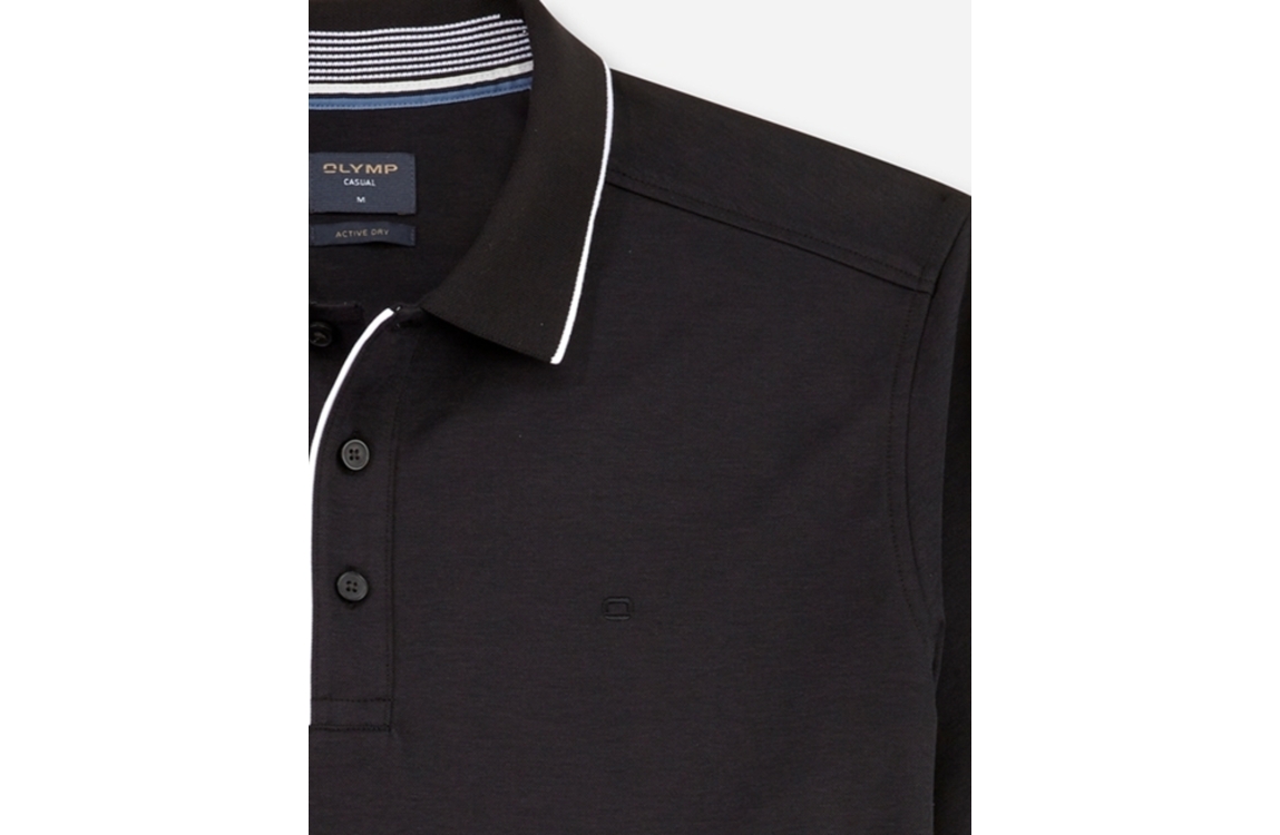 Olymp polo 530172. Dit rechtvallend model heeft een kraag en korte mouwen. Deze zwarte polo van Olymp is doormiddel van knopen te sluiten en is afgewerkt met een witte boorden.