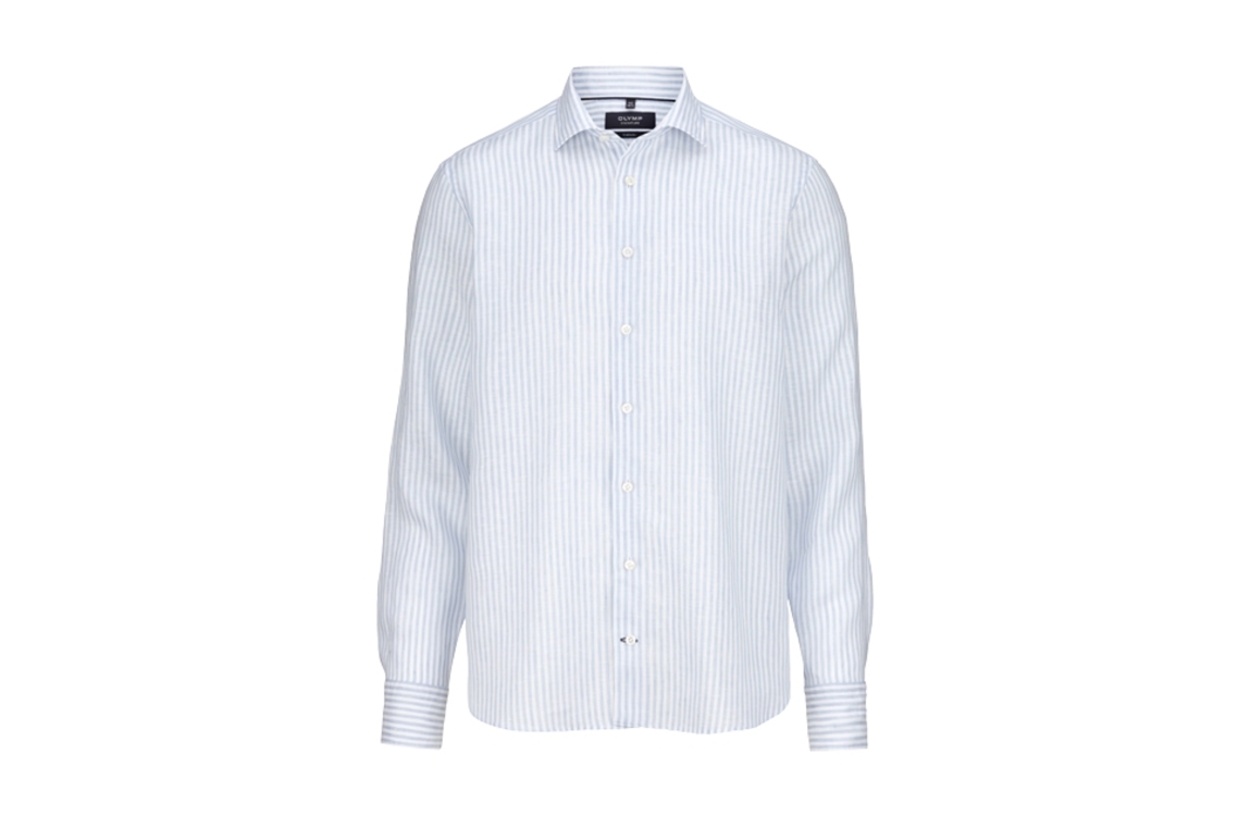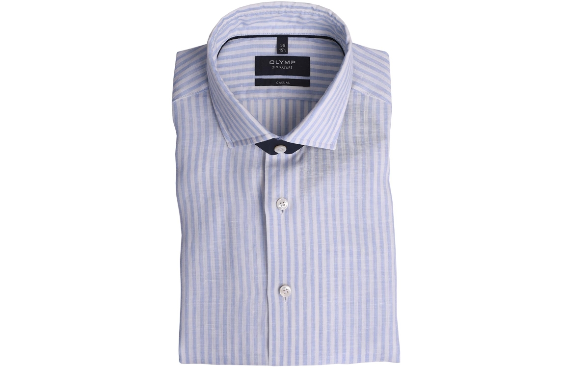 Olymp overhemd 8502|54|11. Dit casual model is voorzien van een kraag en heeft lange mouwen. Dit wit-blauw gestreepte overhemd van Olymp sluit door middel van witte knopen en is bewerkt met een verticale streep. Dit model is uitgevoerd in linnen.