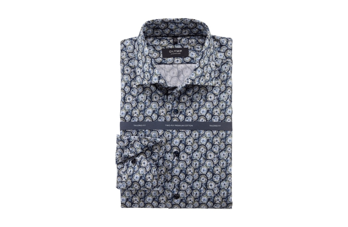 Olymp Signature overhemd 851254. Dit tailord fit model is voorzien van knoopjes op de voorzijde, beschikt over een cut away-kraag en heeft lange mouwen. Dit blauwe overhemd met groene en lichtblauwe patronen is gemaakt van elegante hoogwaardig katoen.