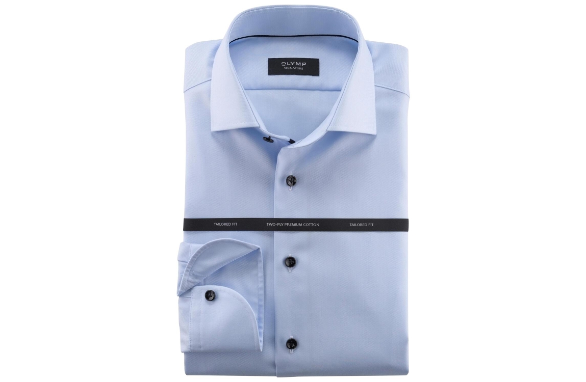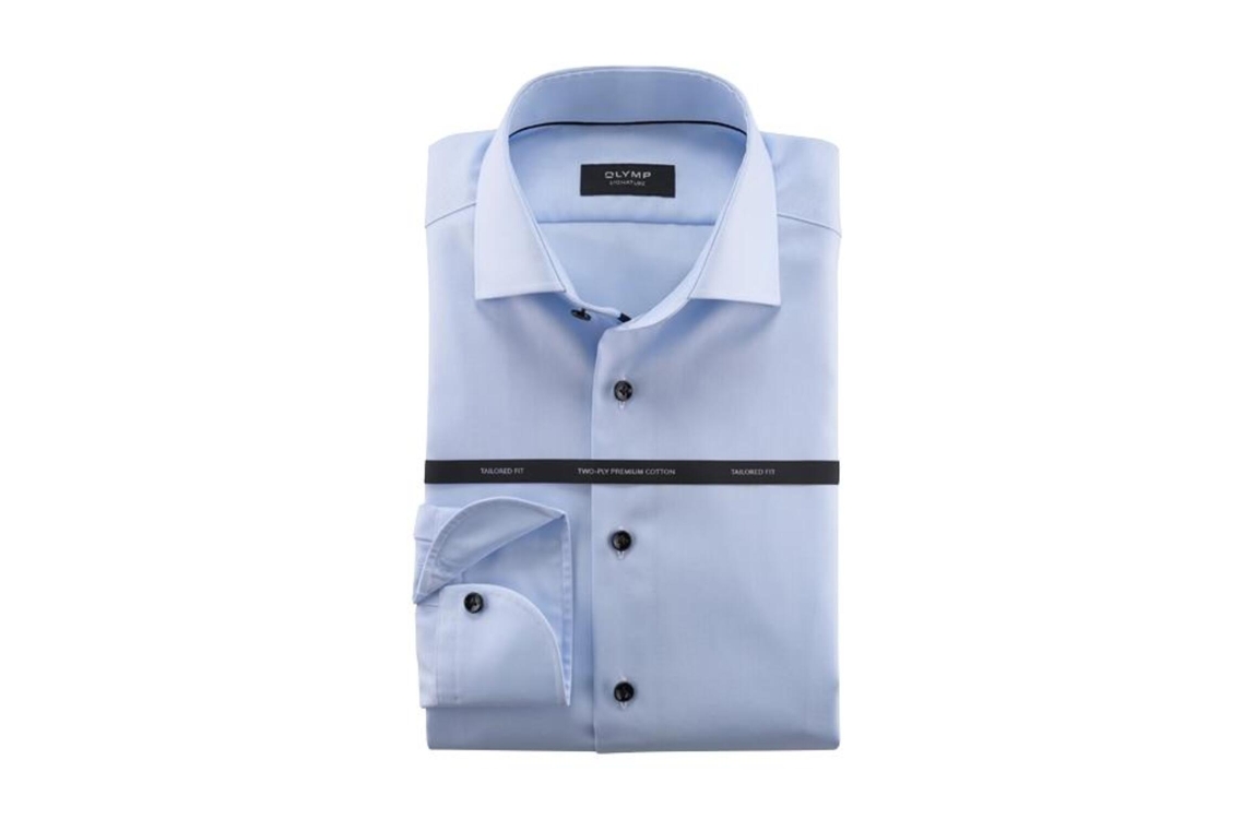 Olymp Signature overhemd 851574. Dit tailored fit model is voorzien van een Kent-kraag en heeft lange mouwen afgewerkt met een split en knoop. Deze lichtblauwe overhemd van Olymp sluit aan de voorzijde door middel van knopen.