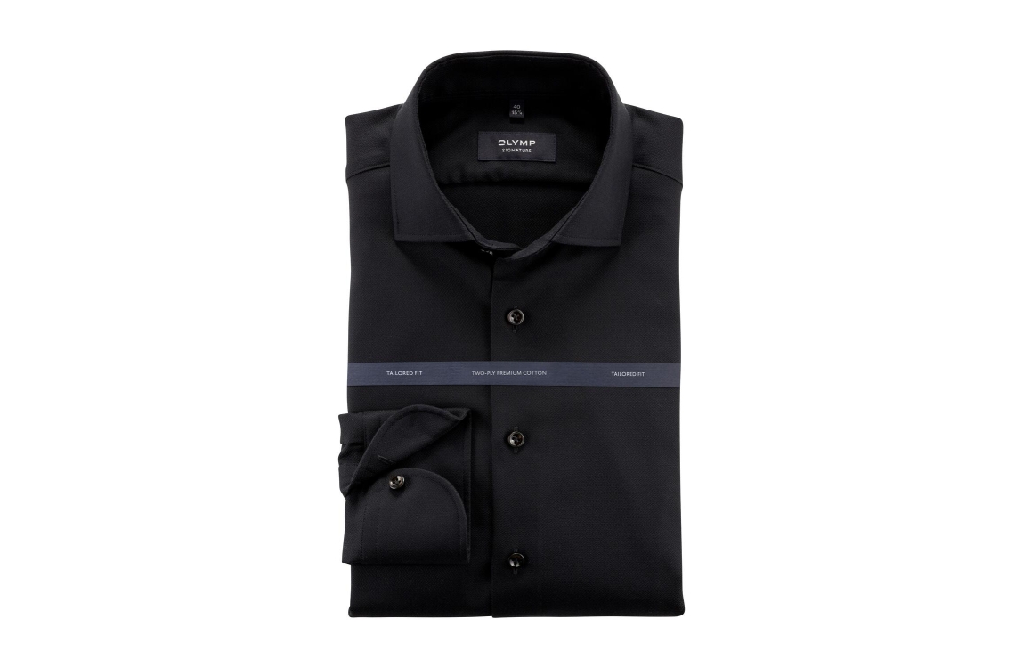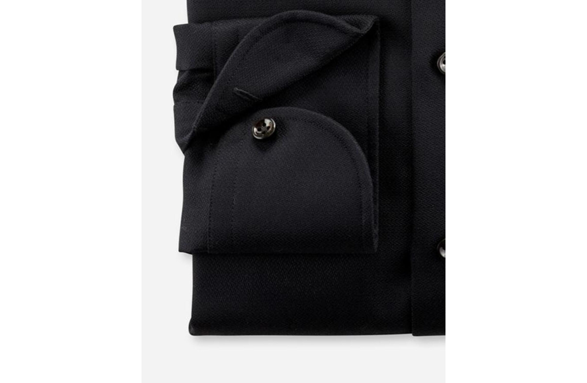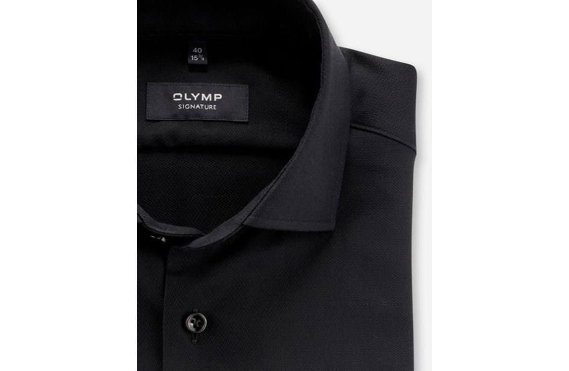 Olymp Signature overhemd. Dit tailord fit model sluit aan de voorzijde met knoopjes, beschikt over een cut away-kraag en heeft lange mouwen. Deze zwarte overhemd van Olymp is uitgevoerd in een elegante hoogwaardig katoen.