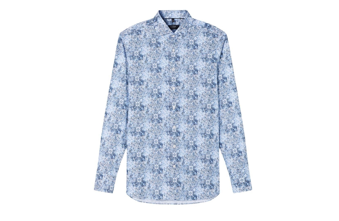 Olymp Signature 852184-Hemden 11. Dit regular fit model heeft een kraag en lange mouwen. Deze blauwe overhemd van Olymp sluit aan de voorzijde door middel van knopen en is all-over bewerkt met een print.