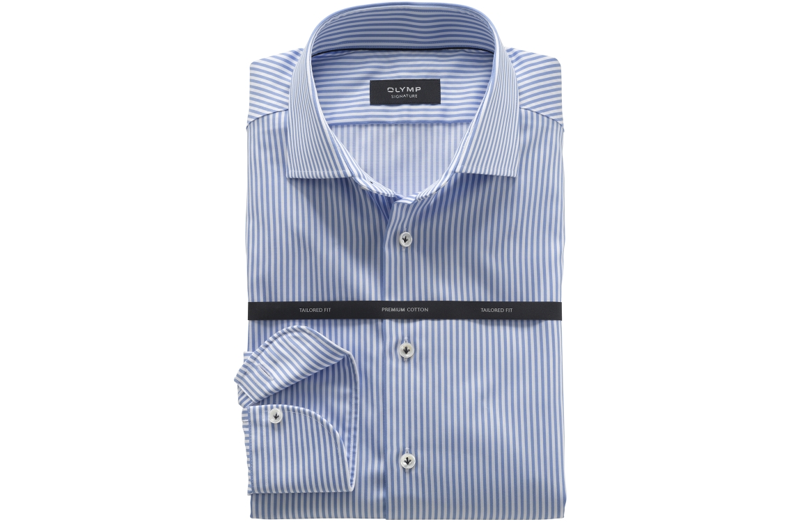 Olymp overhemd 8536/74/11. Dit tailored fit model is voorzien van een kent kraag en heeft lange mouwen. Dit blauw wit gestreepte overhemd van Olymp sluit door middel van knopen en is uitgevoerd in eersteklas katoen.