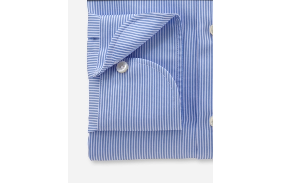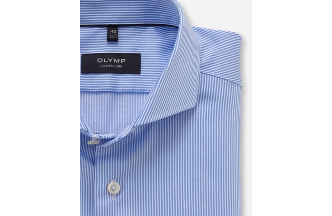 Olymp overhemd 8566|74|11. Dit tailored fit model is voorzien van een kraag en heeft lange mouwen. Dit wit-blauw gestreepte overhemd van Olymp sluit door middel van witte knopen en is bewerkt met een verticale streep.