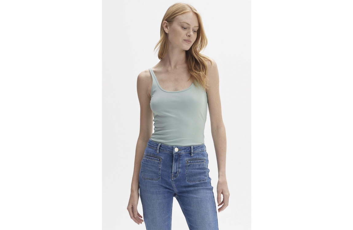 Opus top Ina 235960601. Dit licht getailleerde model heeft een ronde hals en is mouwloos. Deze groene hemd van opus is uitgevoerd in een stretch kwaliteit.