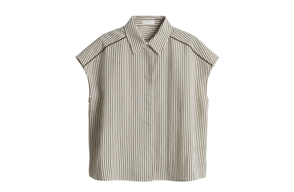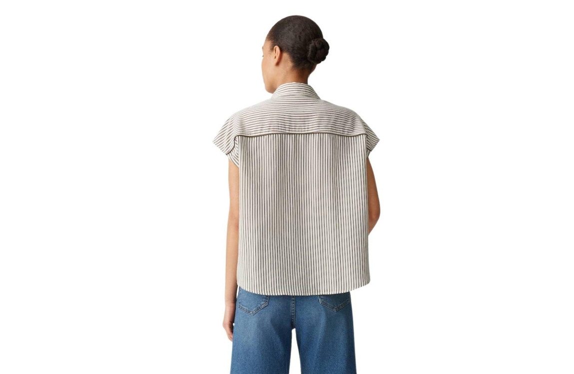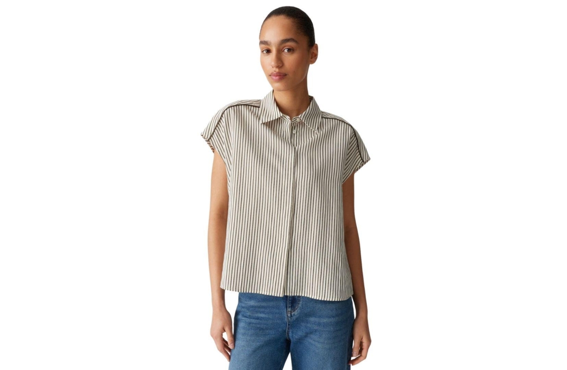 Opus blouse 10441113340. Dit rechtvallend model is voorzien van een kraag en heeft korte kapmouwen. Dexe wit/groen gestreepte blouse van Opus sluit door middel van knopen.