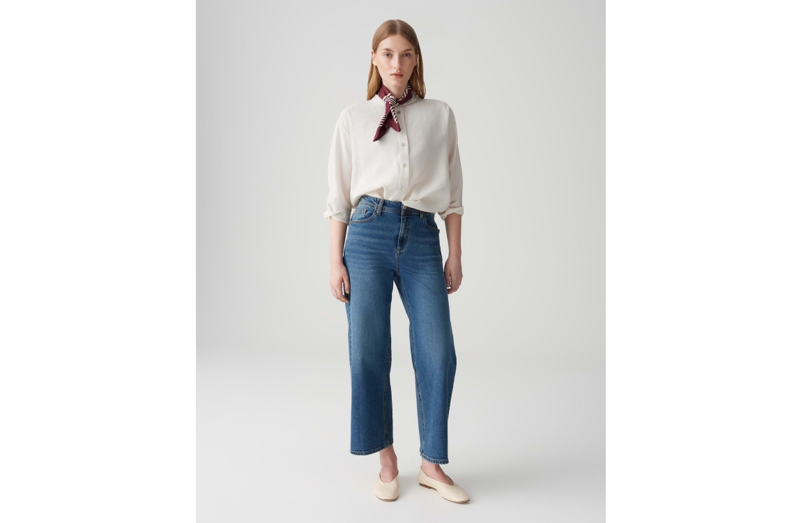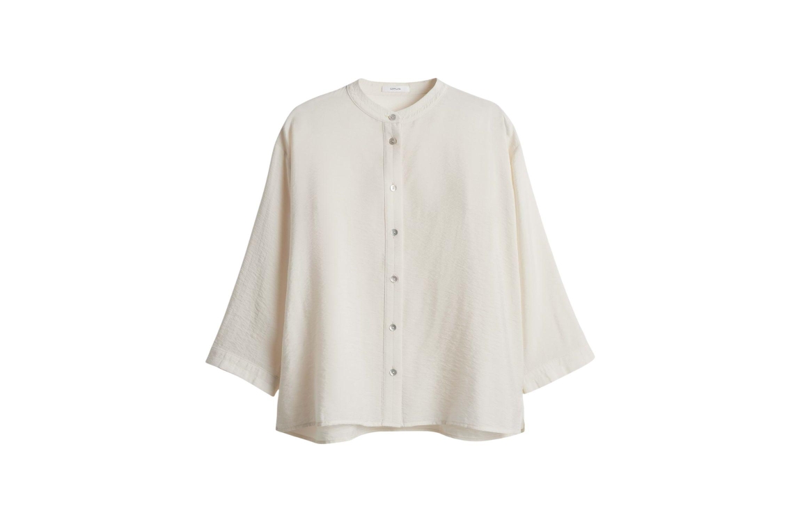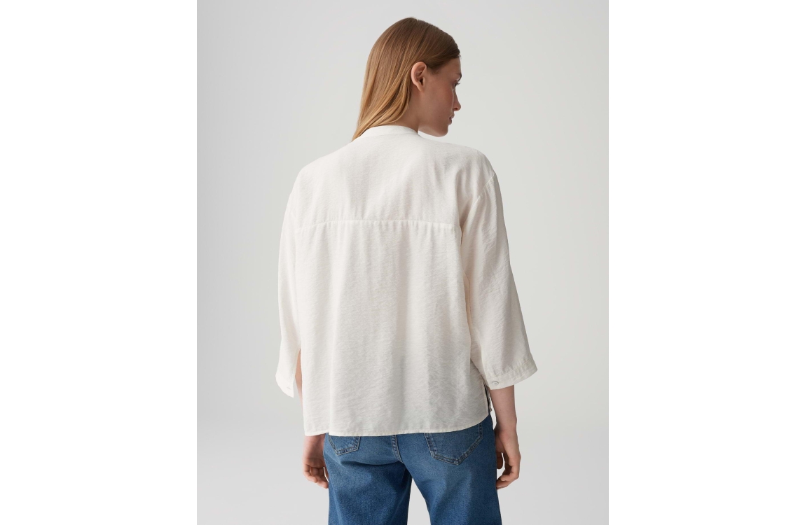 Opus Fanari 20003 Natural glaze. Dit rechtvallende model is voorzien van een ronde hals en heeft een driekwart mouw. Deze off-white blouse van Opus sluit aan de voorzijde door middel van knopen. Dit model heeft een subtiele crushed look.