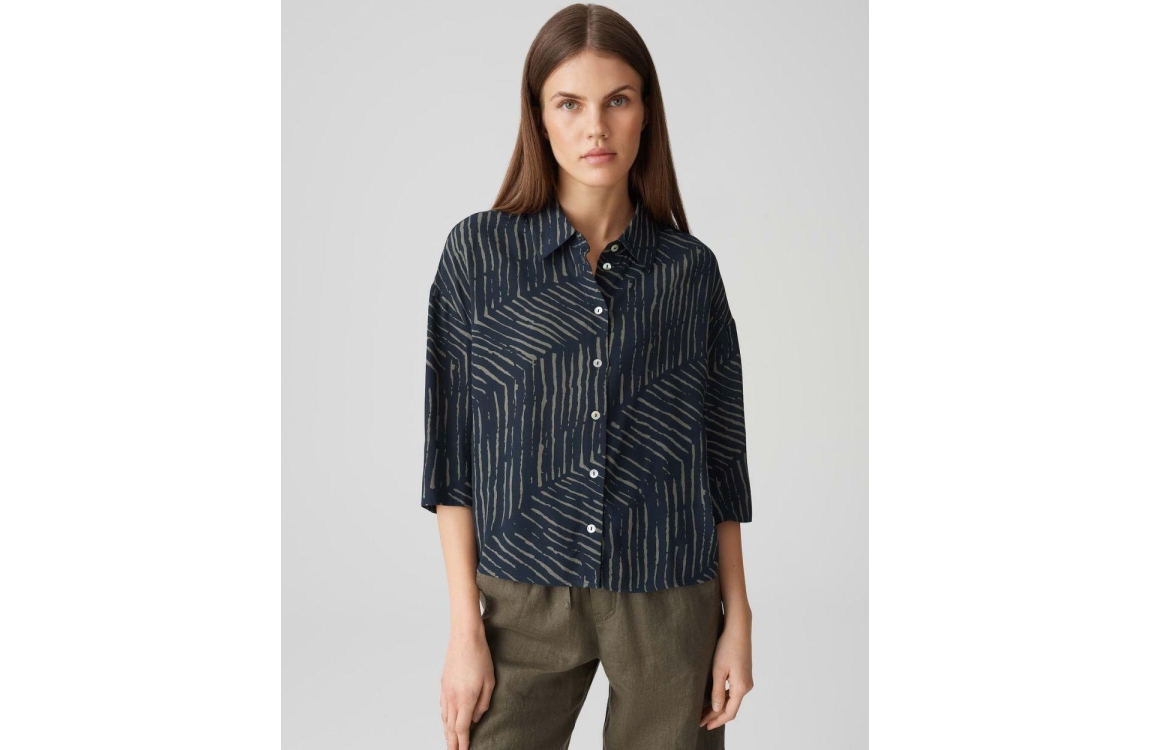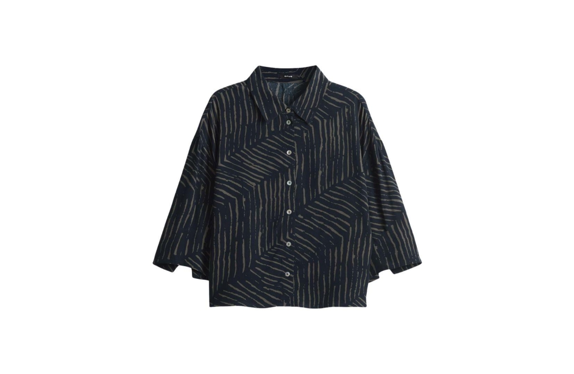 Opus kleding blouse Fiana palm leaves 10418513199100. Dit rechtvallende model is voorzien van een kraag en heeft een driekwart mouw. Deze donker blauwe blouse van Opus sluit aan de voorzijde door middel van knopen en is all-over bewerkt met een gestreepte print.