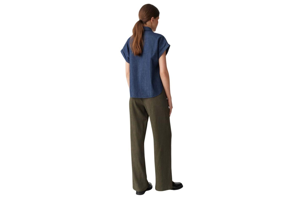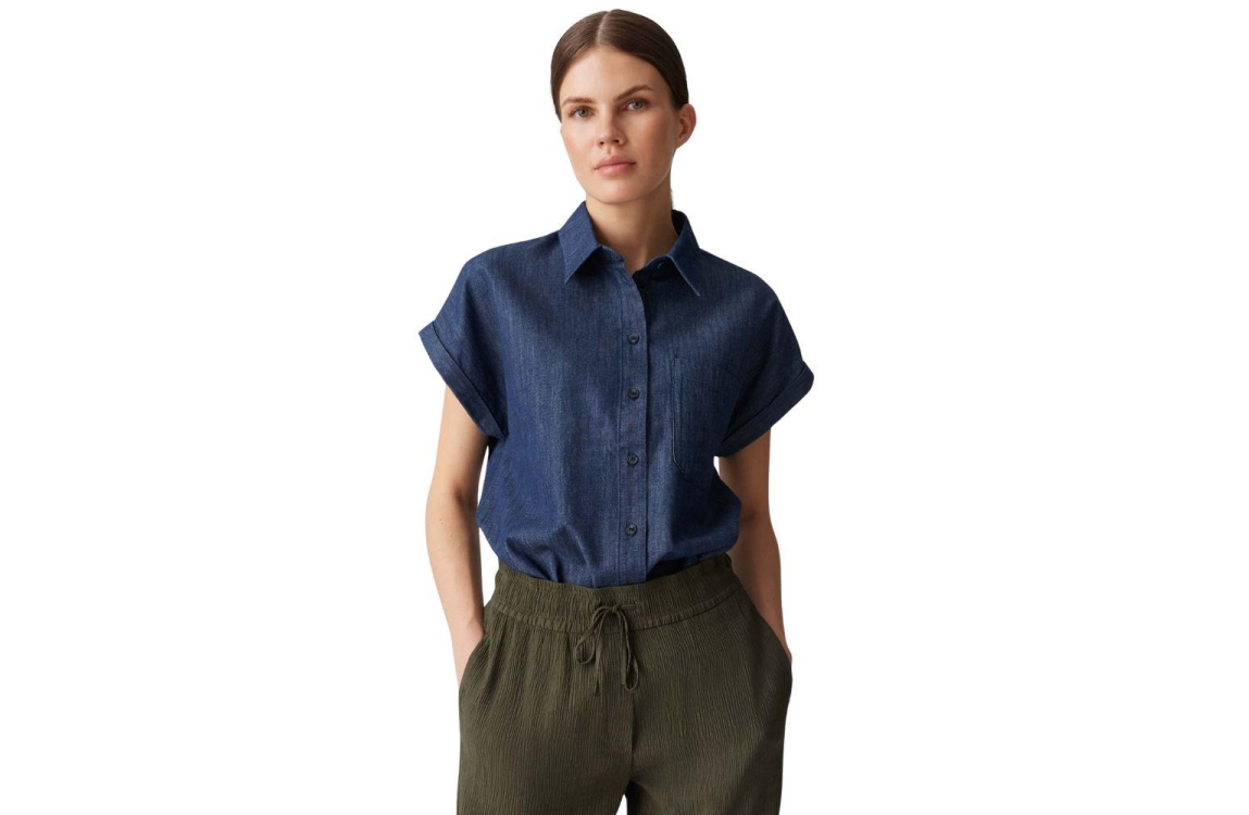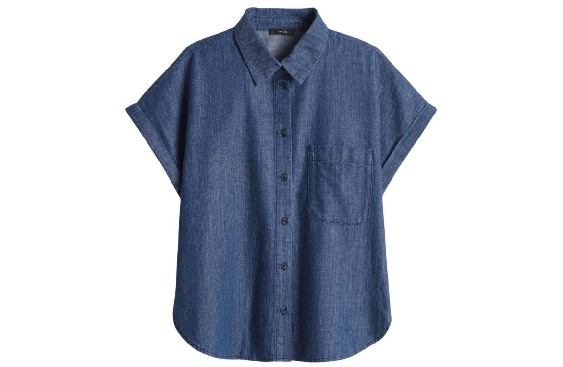 Opus blouse Folmes 10441413341100. Dit wijdvallend model heeft een kraag en overgesneden korte mouwen. Deze denim blouse van Opus sluit aan de voorzijde door middel van knopen en is voorzien van een opgestikte borstzak.